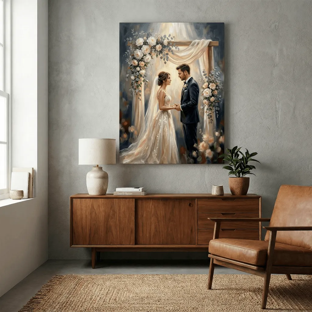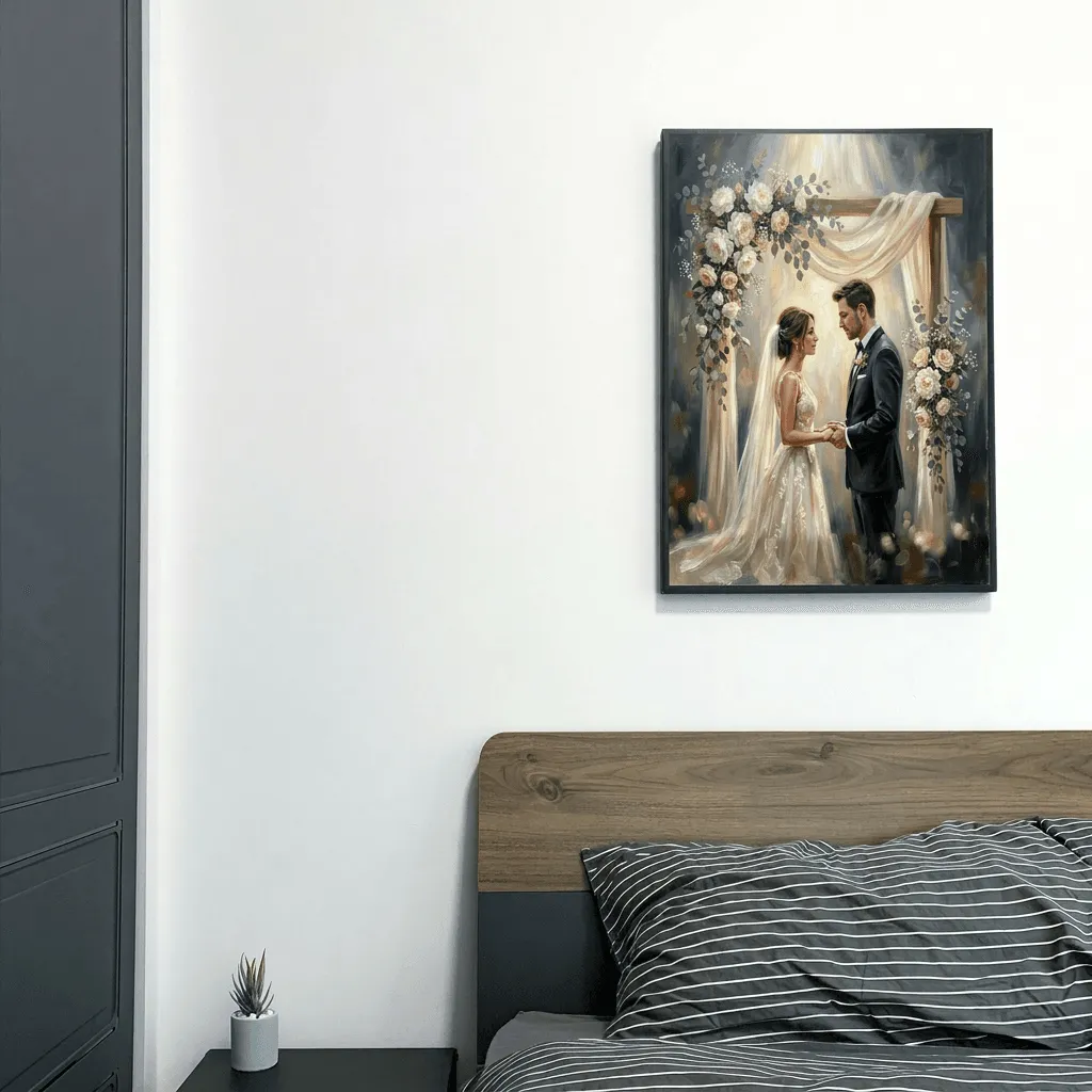Rendered in rich oil paint textures with soft golden light, this romantic wedding scene captures an intimate moment between bride and groom beneath a flowing fabric arch adorned with white roses and eucalyptus. A stunning canvas print that brings timeless elegance and warmth to any bedroom or living space.