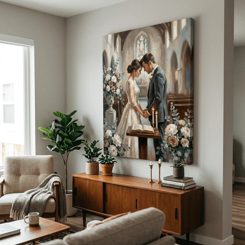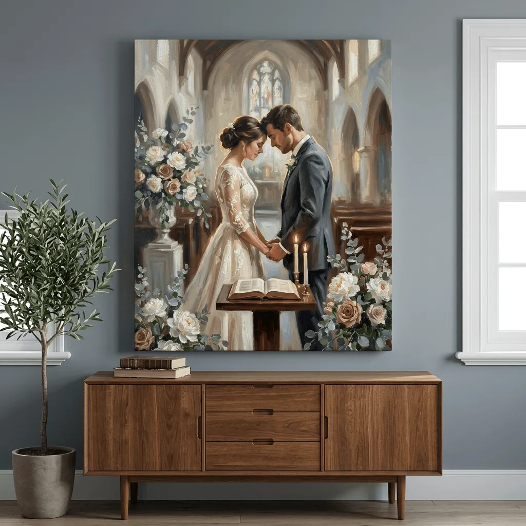 Rendered in rich oil paint with warm, luminous tones, this romantic wedding scene captures an intimate moment at the altar surrounded by elegant floral arrangements. A timeless canvas print that brings sophistication and emotional depth to any bedroom or living space.