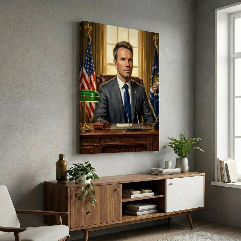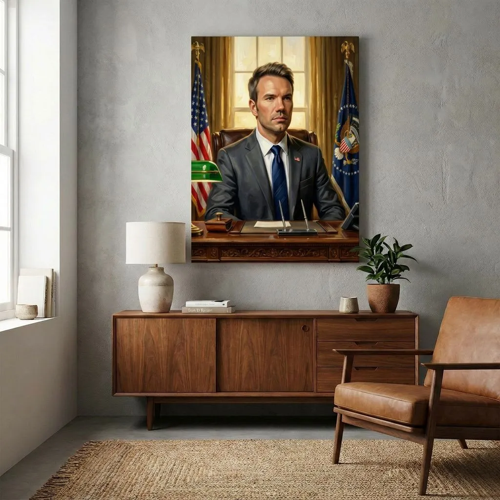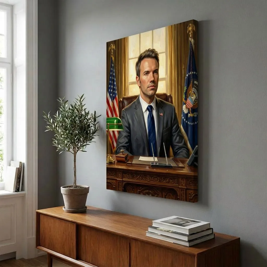 Rendered in rich oil paint textures with warm golden tones, this striking executive portrait captures commanding presence at an ornate desk. A sophisticated canvas print perfect for offices, studies, and professional spaces seeking timeless authority and gravitas.
