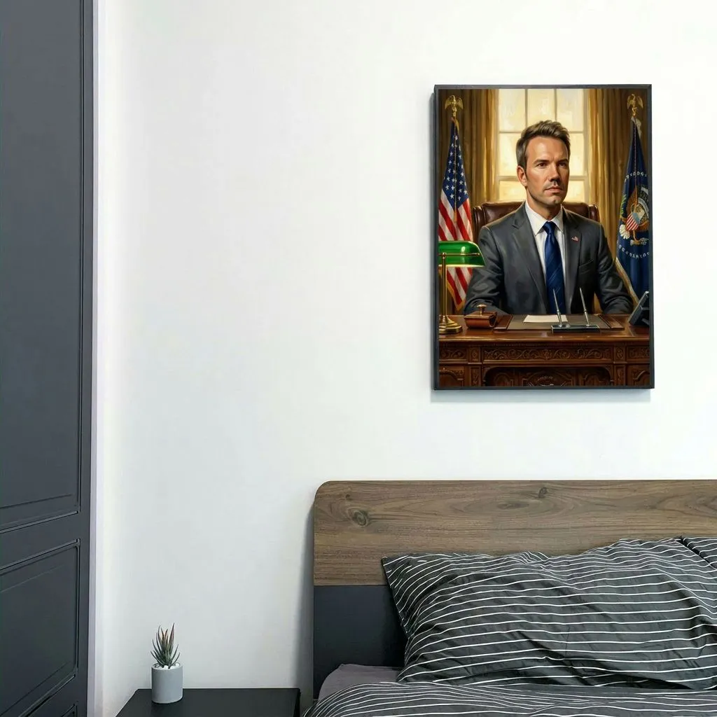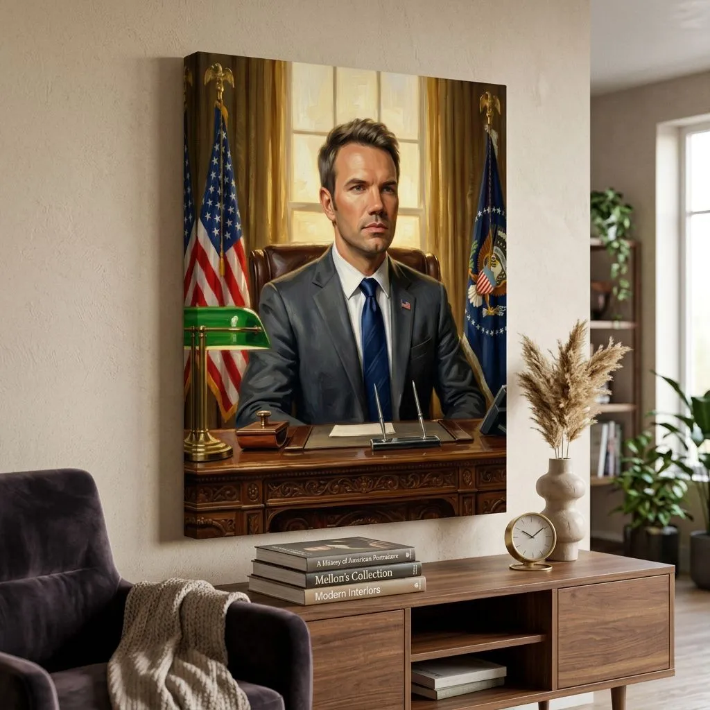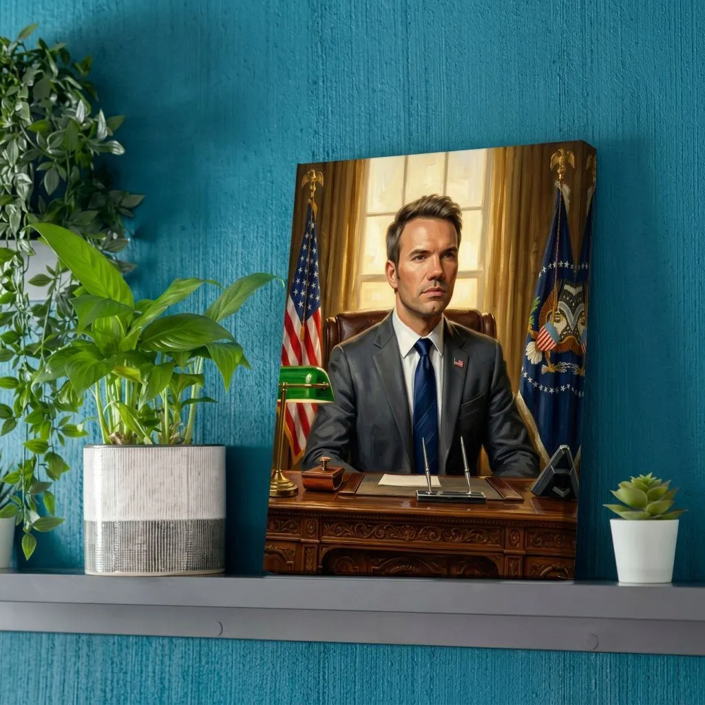 Rendered in rich oil paint textures with warm golden tones, this striking executive portrait captures commanding presence at an ornate desk. A sophisticated canvas print perfect for offices, studies, and professional spaces seeking timeless authority and gravitas.