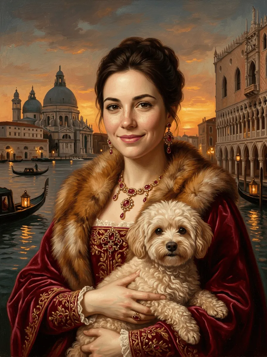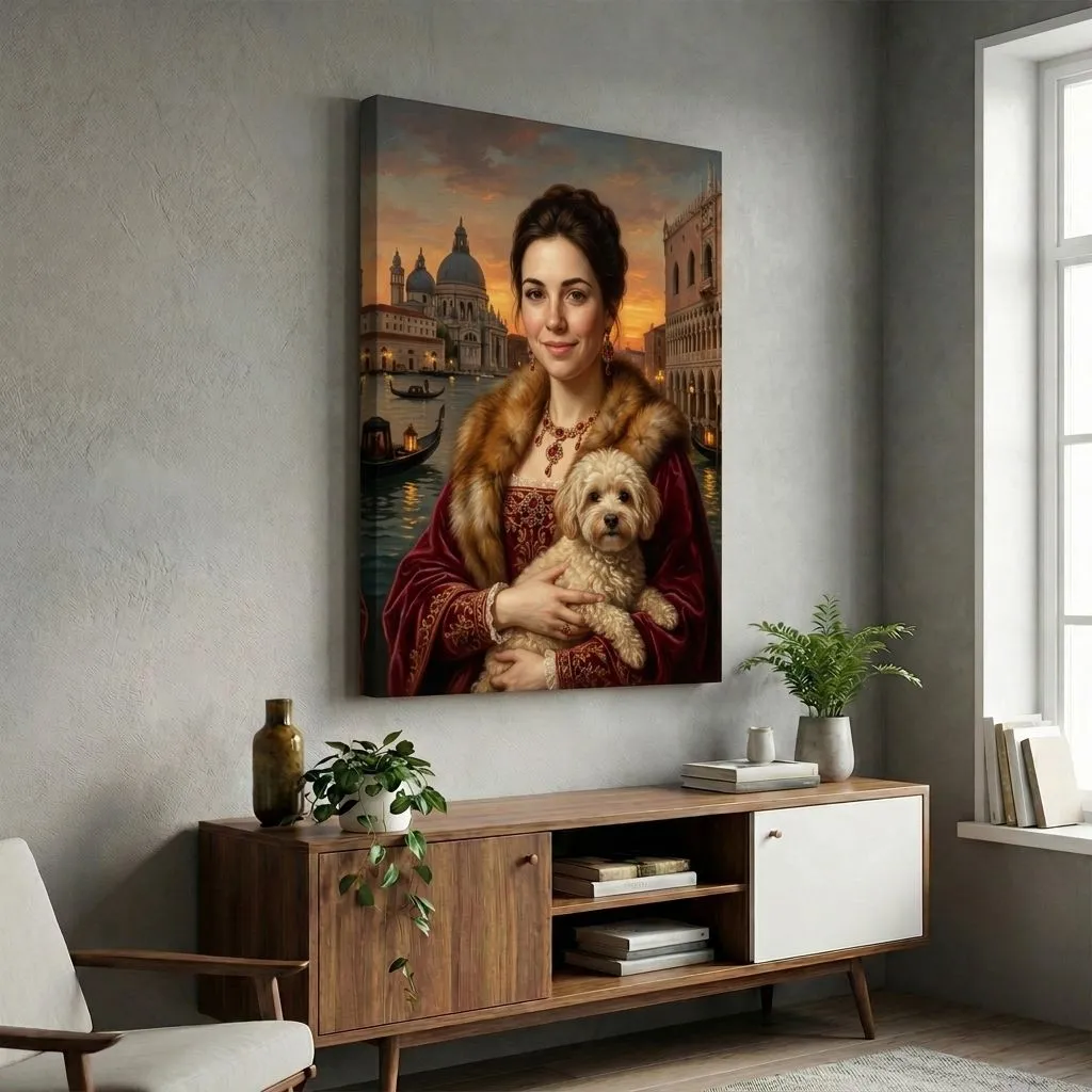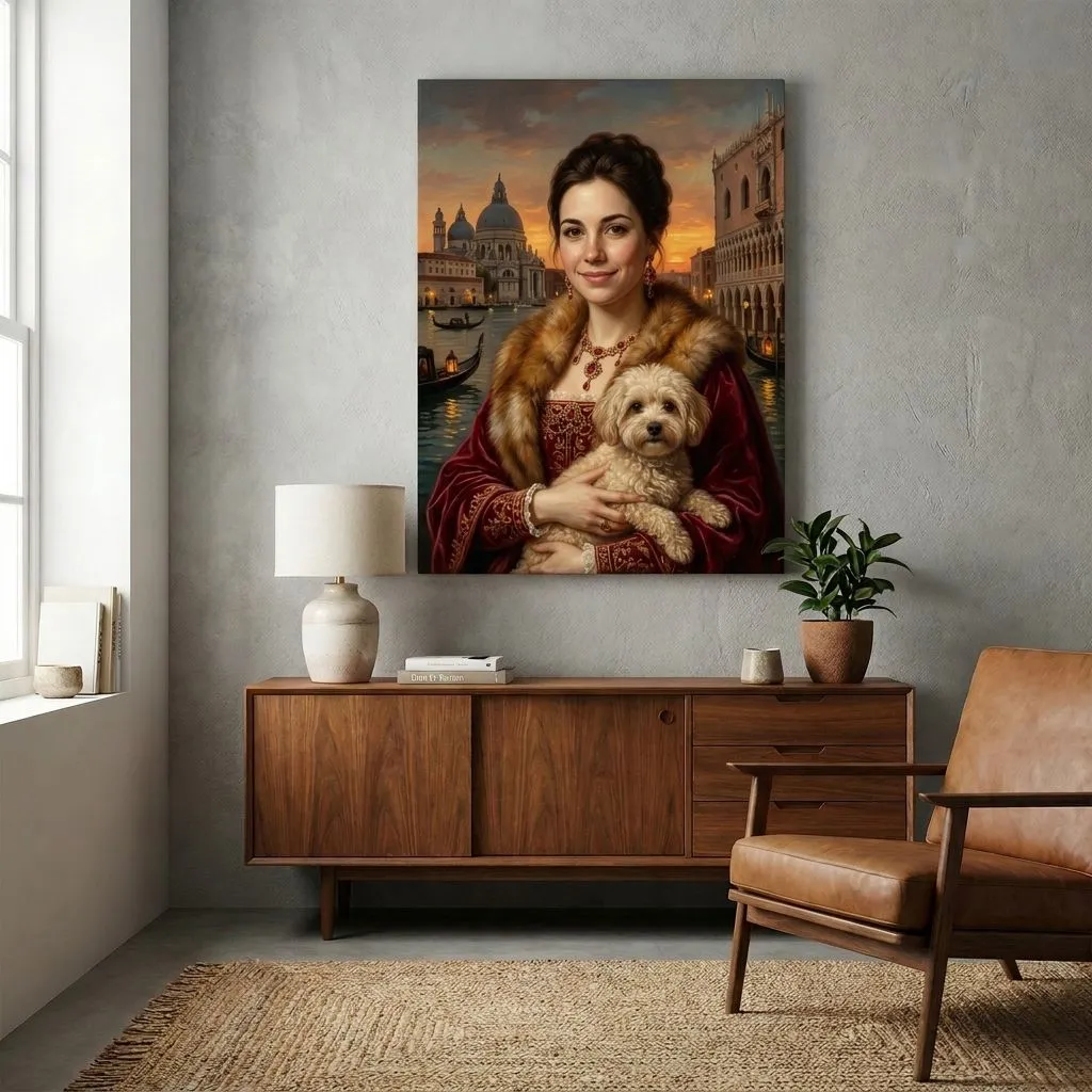 Rendered in rich oil paint textures with warm golden tones, this striking Renaissance-inspired portrait captures a woman adorned in luxurious fur and crimson velvet against a Venetian sunset backdrop. A sophisticated canvas print that brings Old Master elegance and timeless beauty to any room.