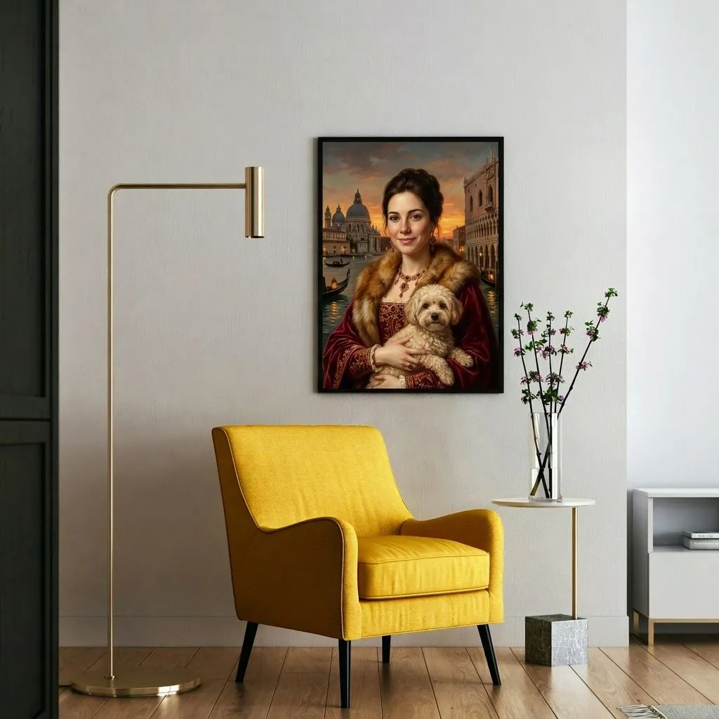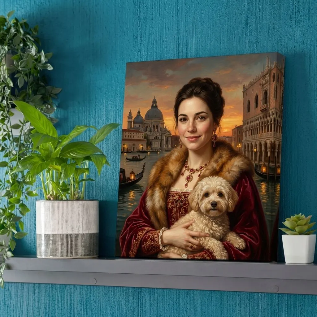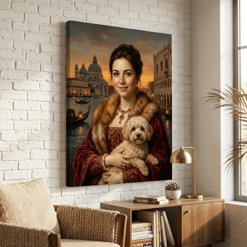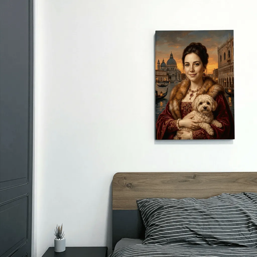 Rendered in rich oil paint textures with warm golden tones, this striking Renaissance-inspired portrait captures a woman adorned in luxurious fur and crimson velvet against a Venetian sunset backdrop. A sophisticated canvas print that brings Old Master elegance and timeless beauty to any room.