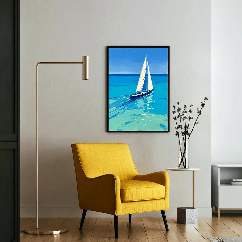 Rendered in rich oil paint with bold brushstrokes and layered texture, this stunning sailboat seascape captures a serene coastal moment. Vibrant turquoise and azure tones create depth and movement across the canvas, making it a captivating wall art piece for any room.
