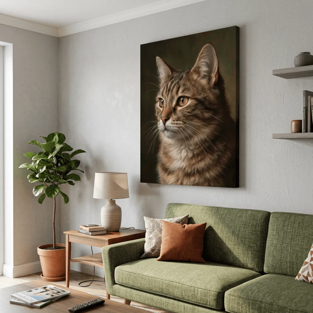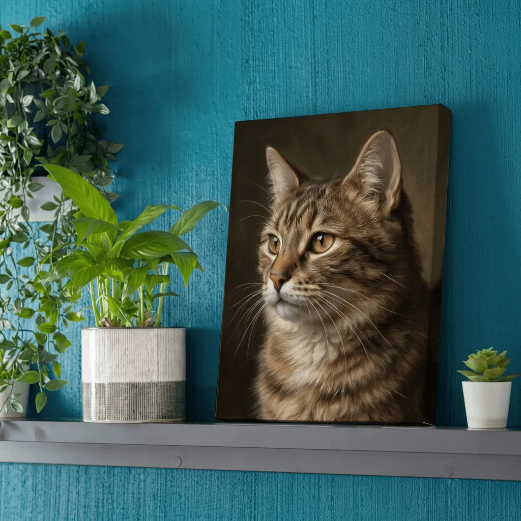 Rendered in rich oil paint with meticulous detail, this striking tabby cat portrait captures luminous golden eyes and delicate whiskers against a warm, muted background. A sophisticated canvas print perfect for pet lovers seeking gallery-quality wall art.