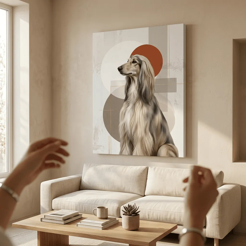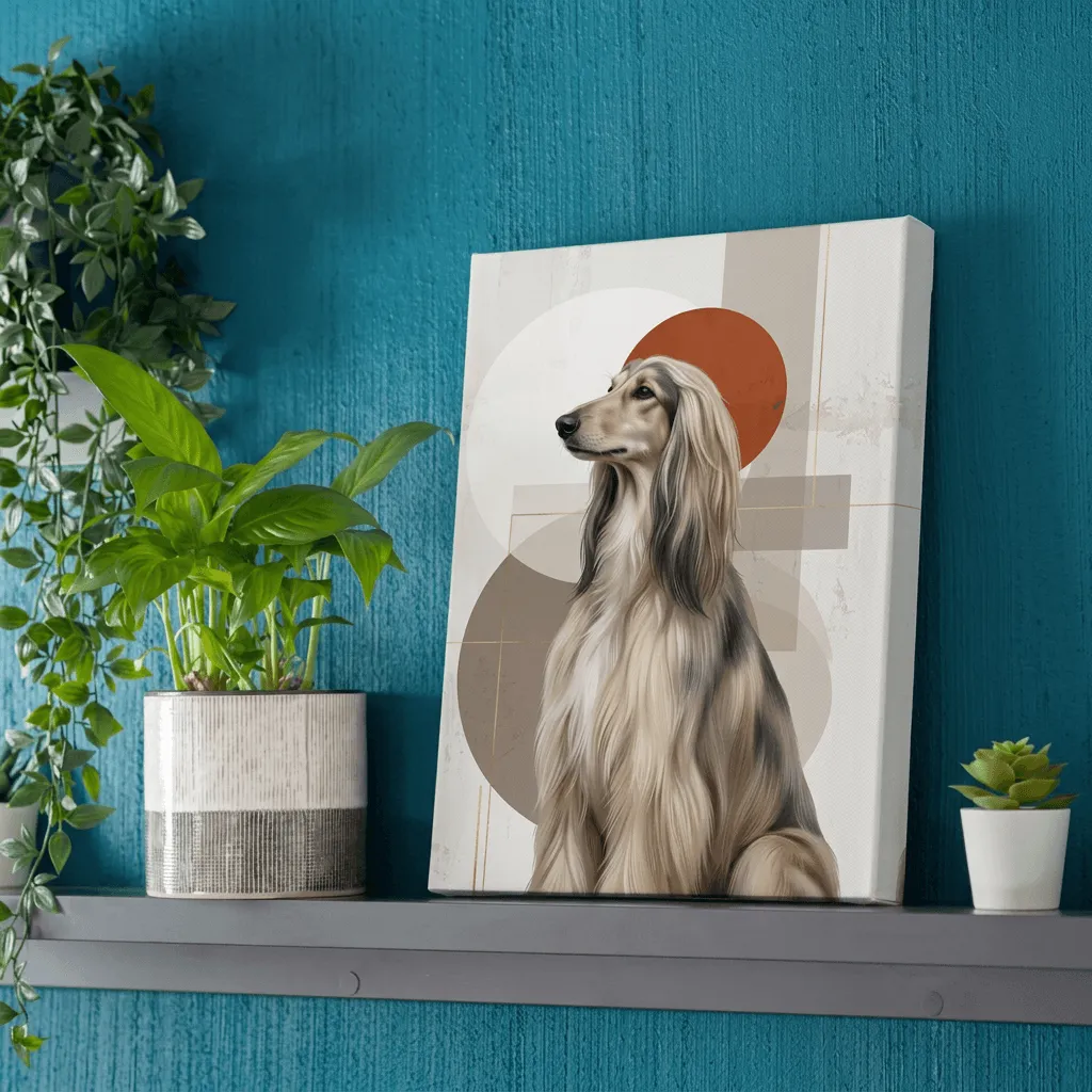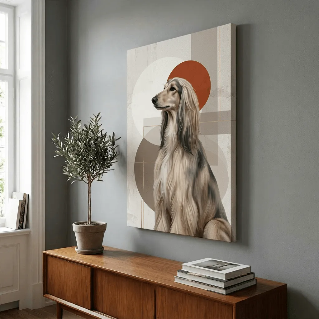 A striking modern composition featuring realistic dog portraiture enhanced with geometric shapes and warm terracotta accents. This contemporary canvas print combines soft fur textures with bold abstract elements, creating sophisticated wall art perfect for pet lovers and modern home decor.