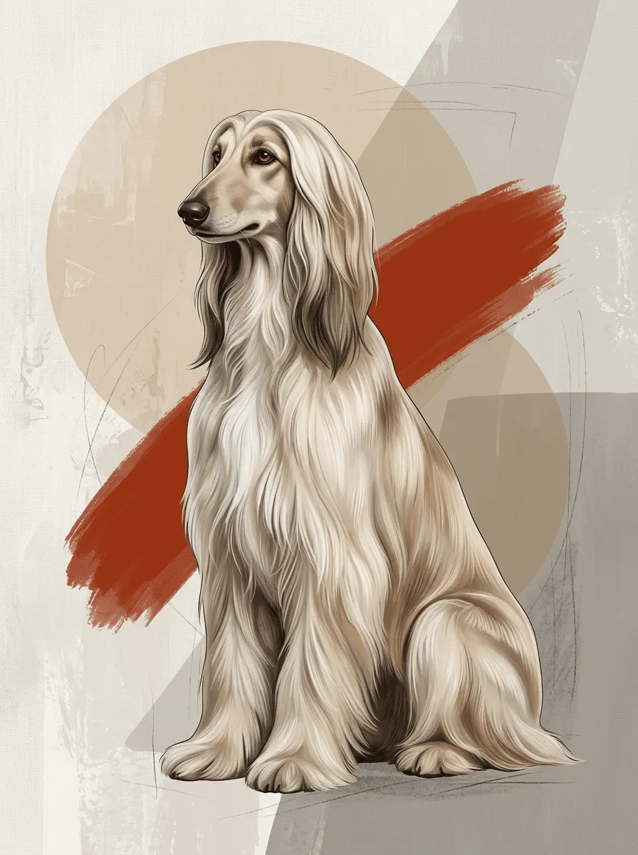 This striking ink-rendered portrait features a graceful long-haired dog with expressive eyes, complemented by bold red brushstroke accents and geometric background elements. A contemporary canvas print that brings sophisticated pet portraiture and modern artistic flair to any room.