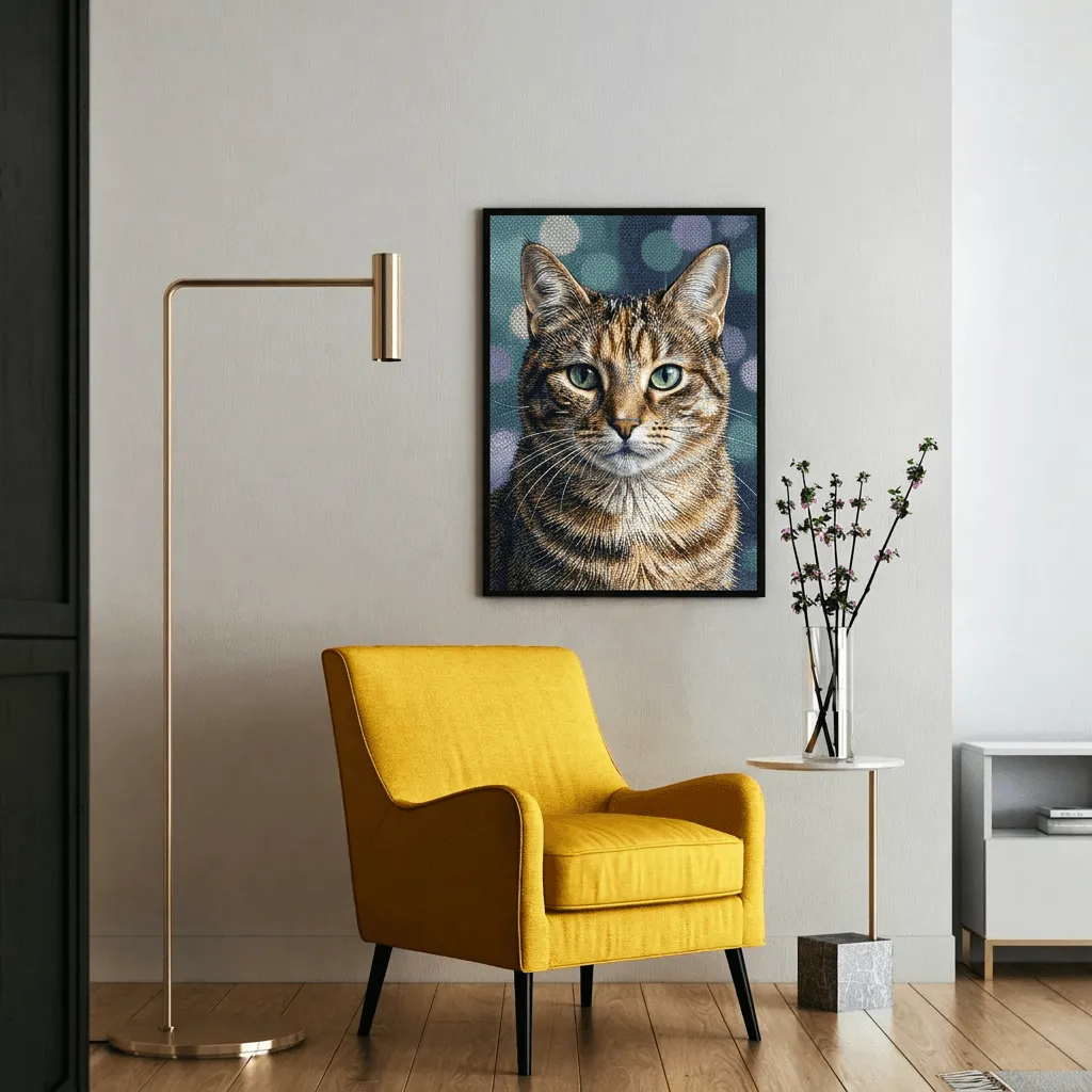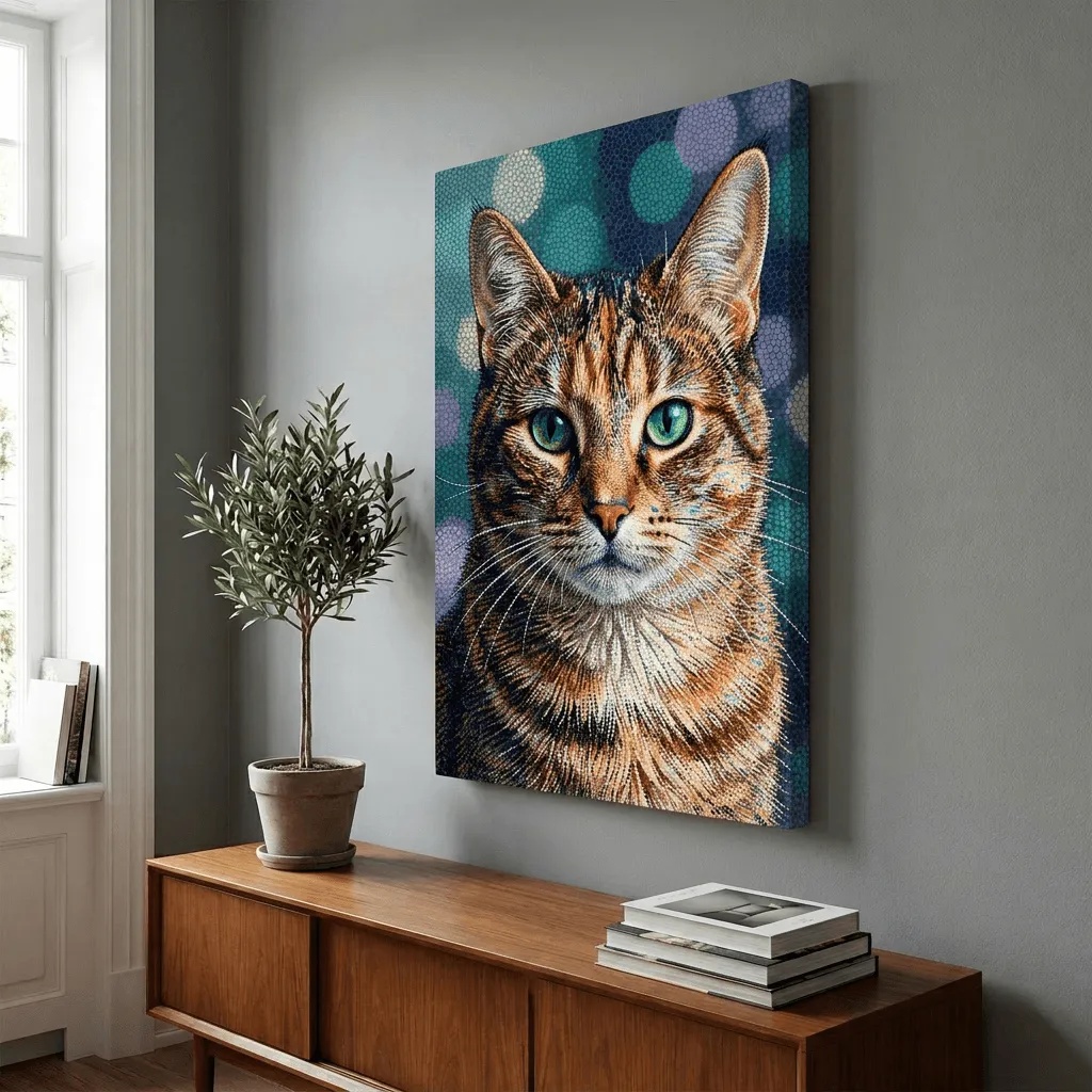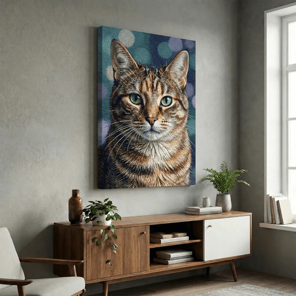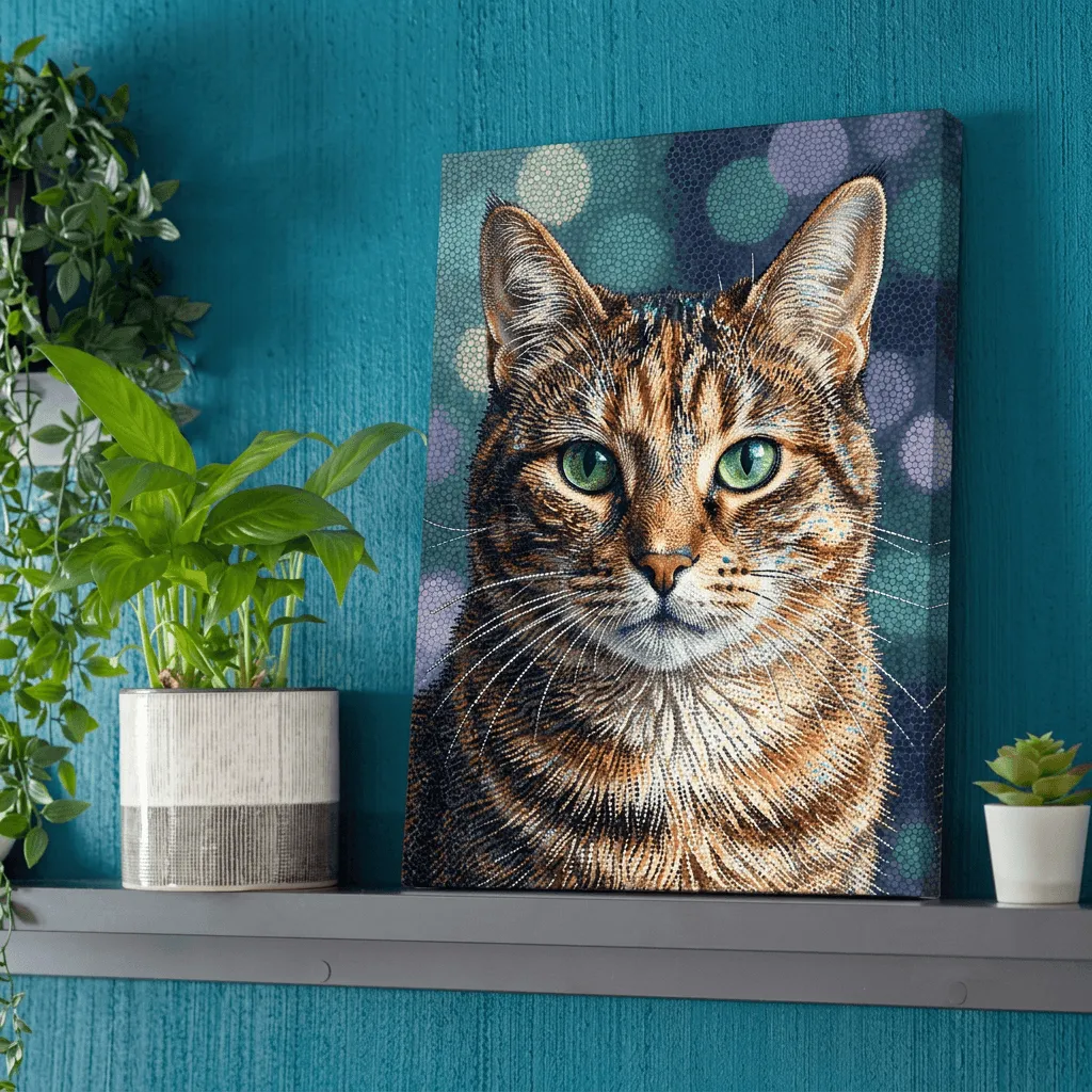 This striking mosaic art style renders a tabby cat with luminous emerald eyes and intricate tile-work detailing. The pointillist technique creates remarkable depth and texture, perfect for pet lovers seeking a sophisticated canvas print that brings artistic elegance to any room.