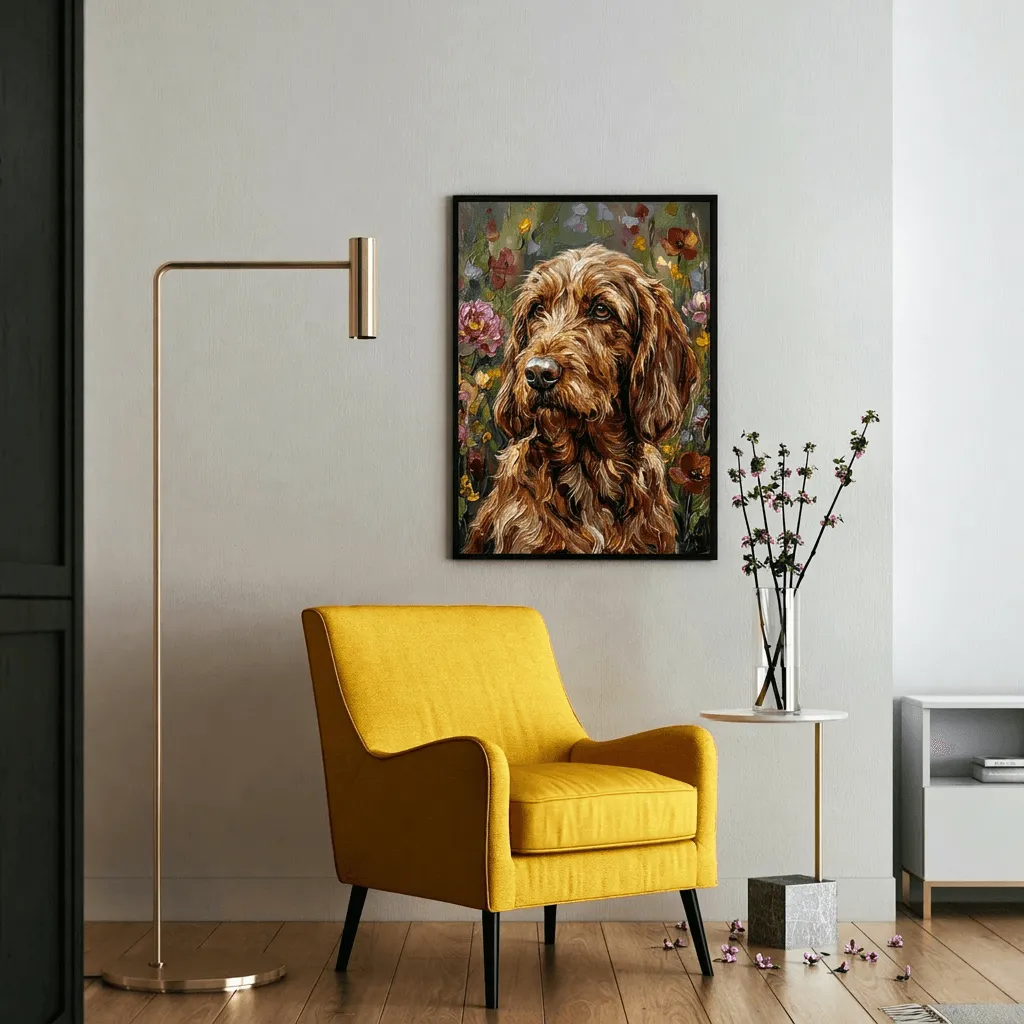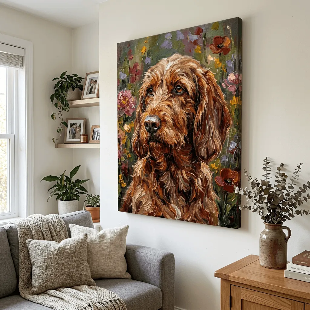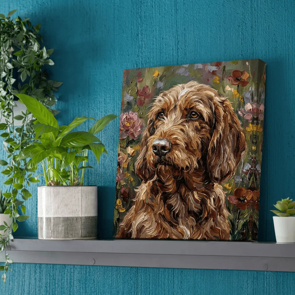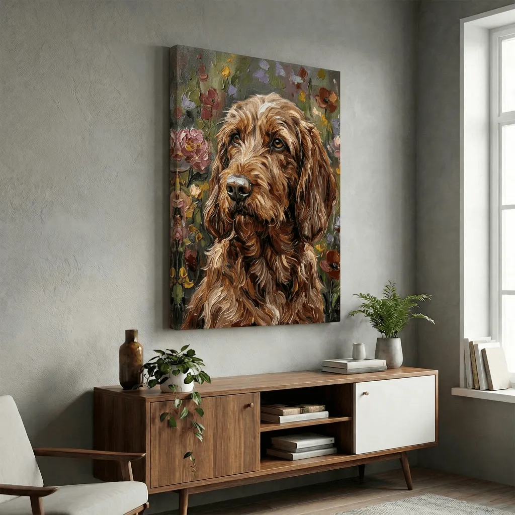 Rendered in rich oil paint with expressive brushstrokes, this charming dog portrait captures a gentle spaniel surrounded by vibrant wildflowers. Warm earth tones and layered florals create depth and character, making it a perfect canvas print for pet lovers and nature-inspired home decor.