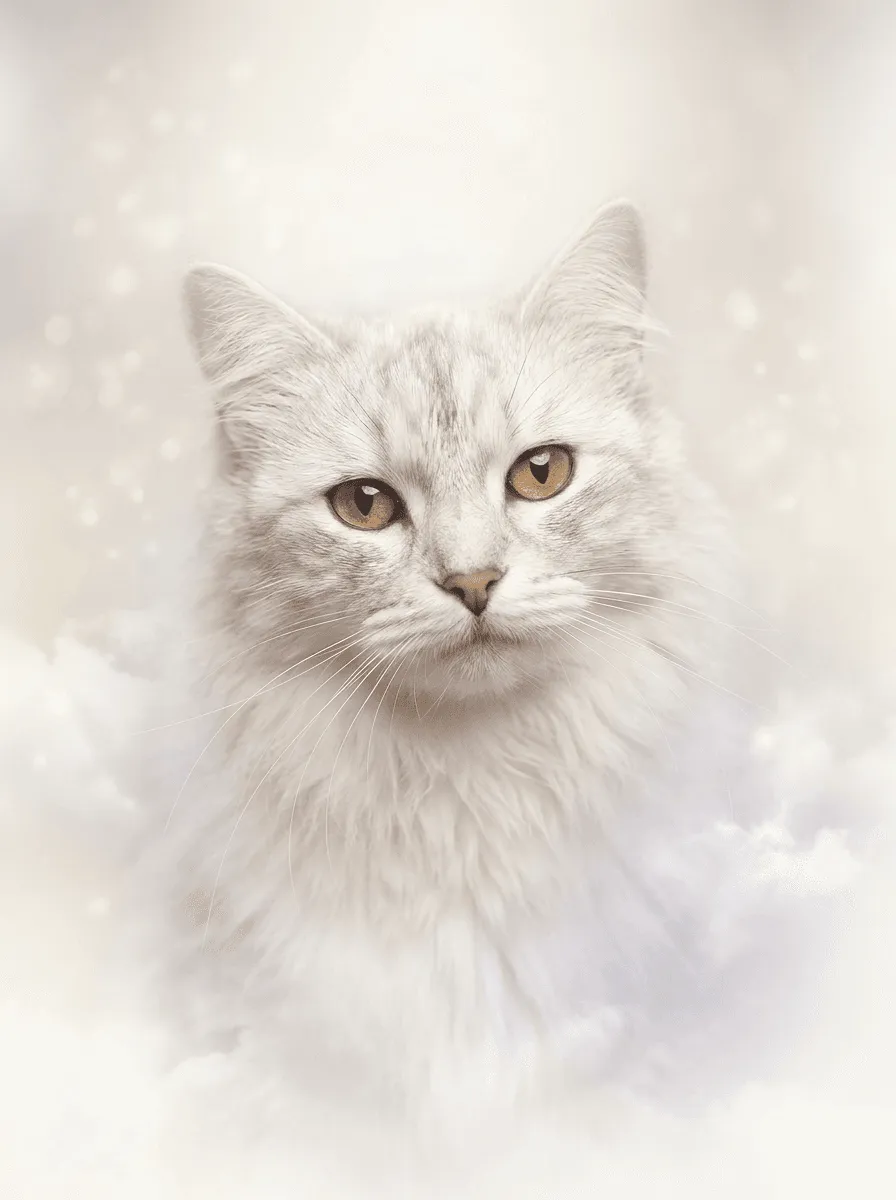 Photorealistic white cat portrait with piercing golden eyes and soft dreamy background. Meticulous detail and subtle texturing bring warmth to your wall art collection.
