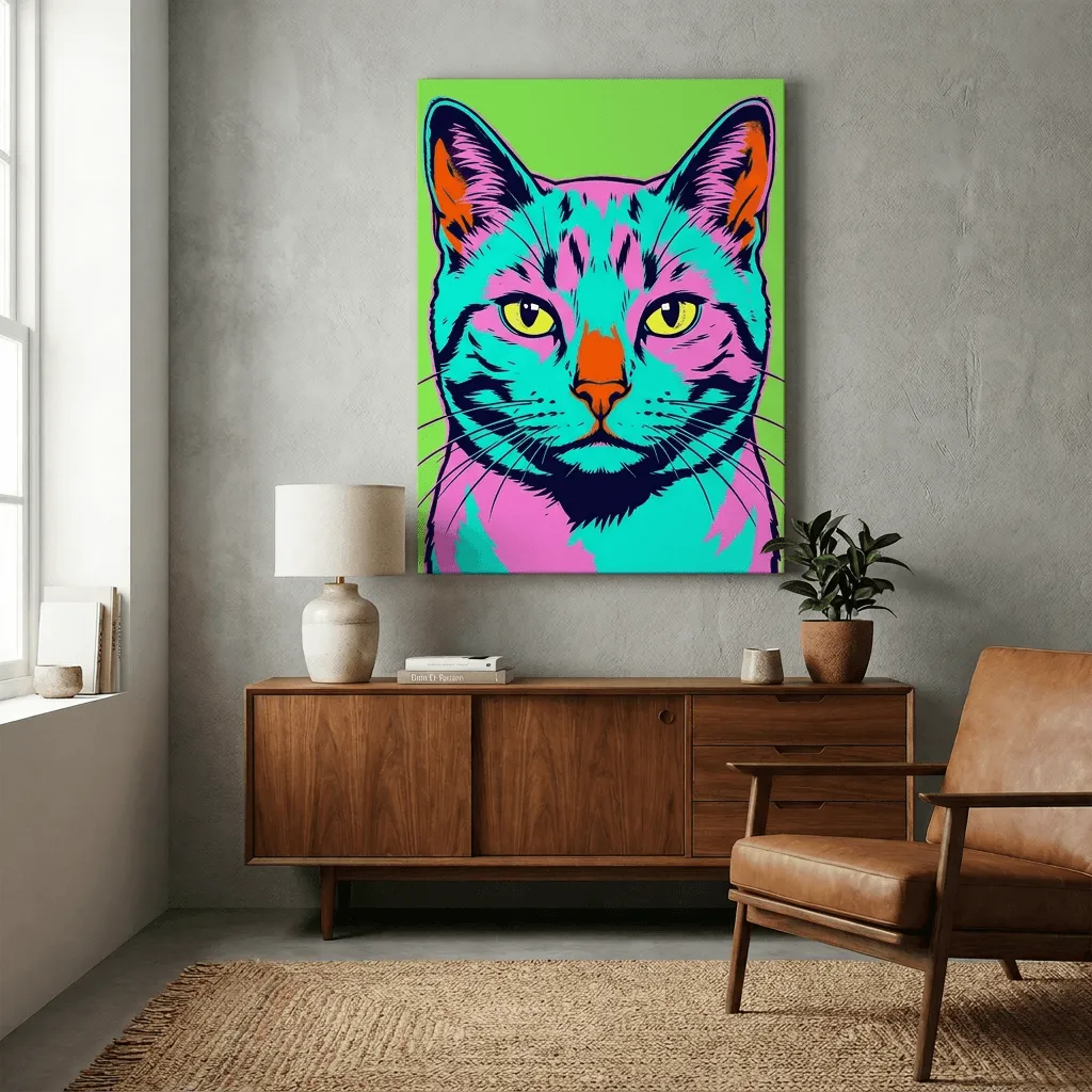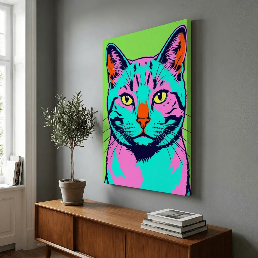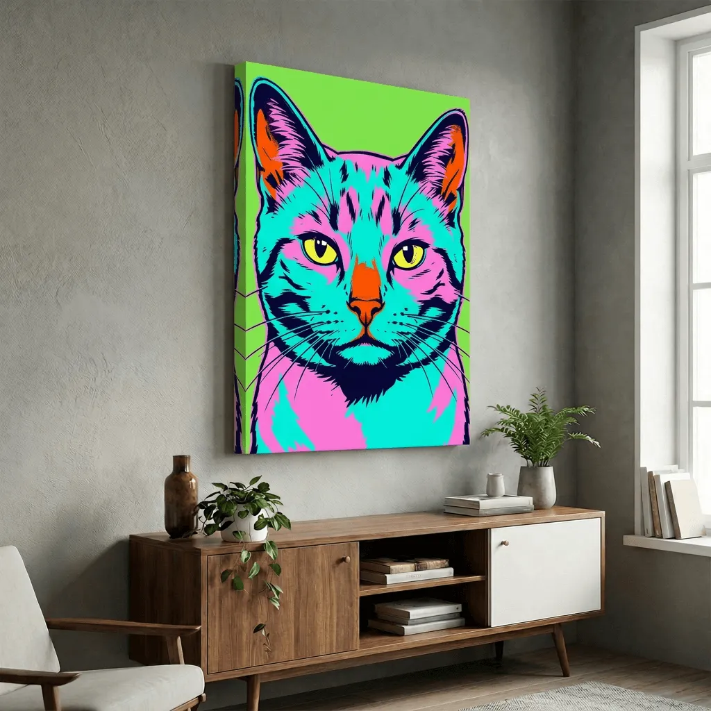 This striking pop art canvas features vibrant neon colors — electric cyan, hot pink, and orange — with bold black outlines and piercing yellow eyes. A contemporary wall art print that brings playful energy and modern flair to any room.
