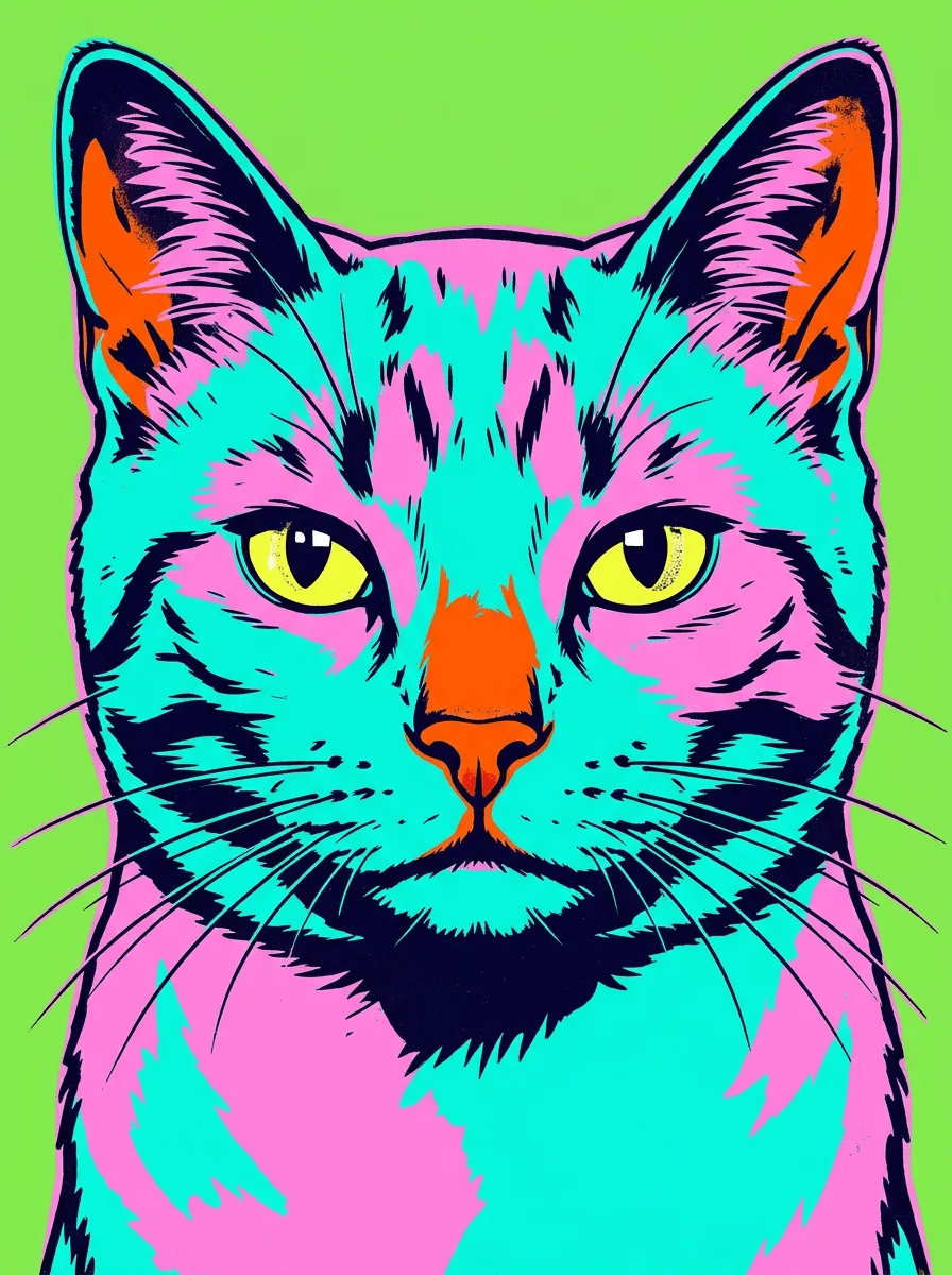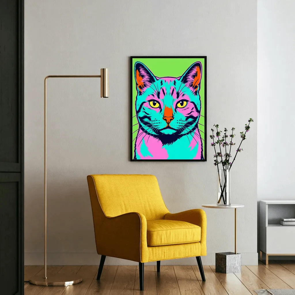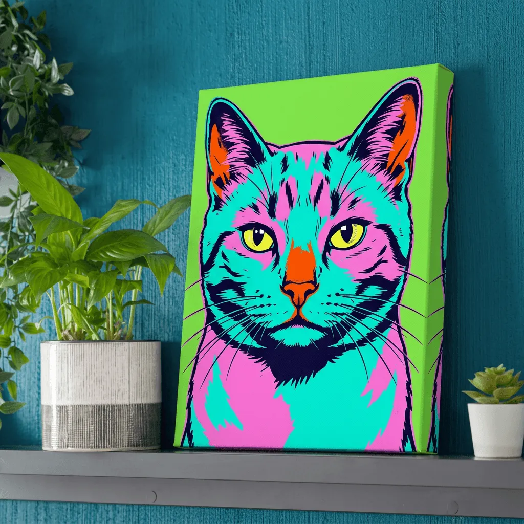 This striking pop art canvas features vibrant neon colors — electric cyan, hot pink, and orange — with bold black outlines and piercing yellow eyes. A contemporary wall art print that brings playful energy and modern flair to any room.