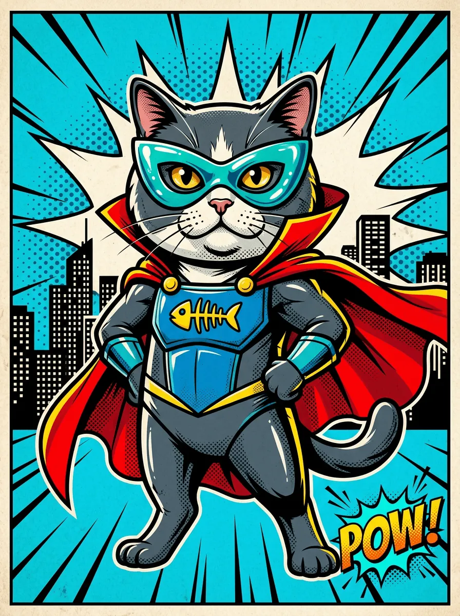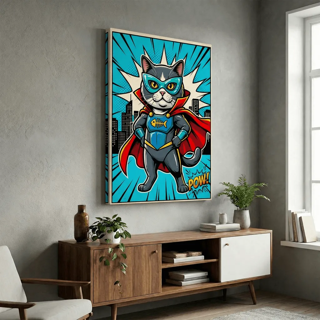 Bold pop art style illustration featuring a masked cat superhero in vibrant turquoise, red, and yellow tones. This striking comic-inspired canvas print captures dynamic energy with bold outlines and halftone patterns, perfect for adding playful personality to any room.