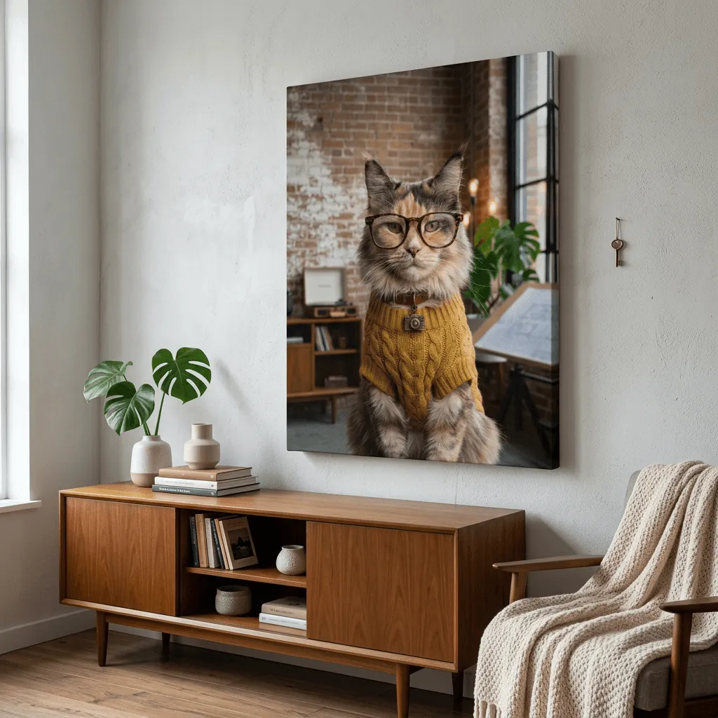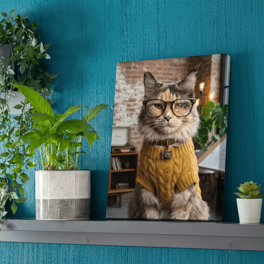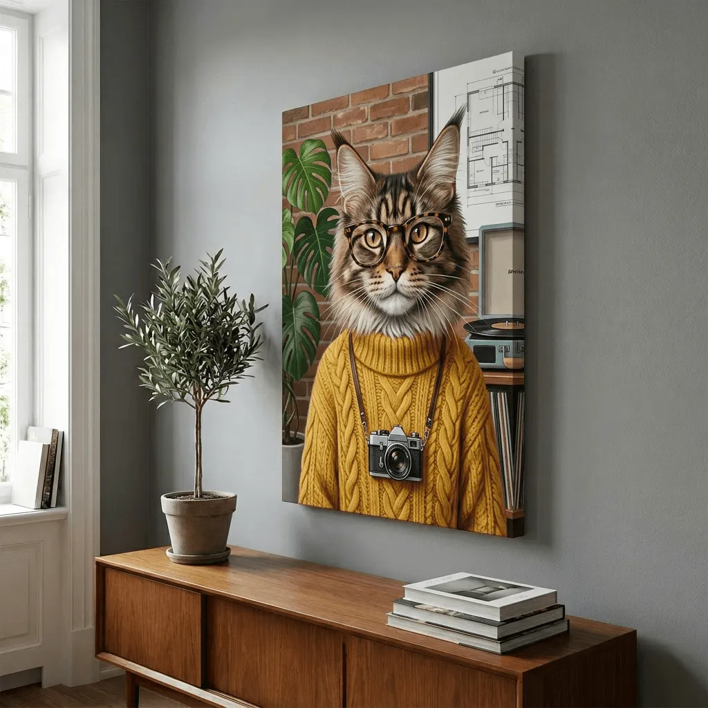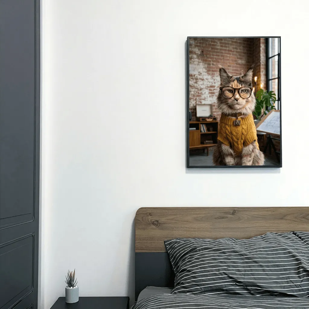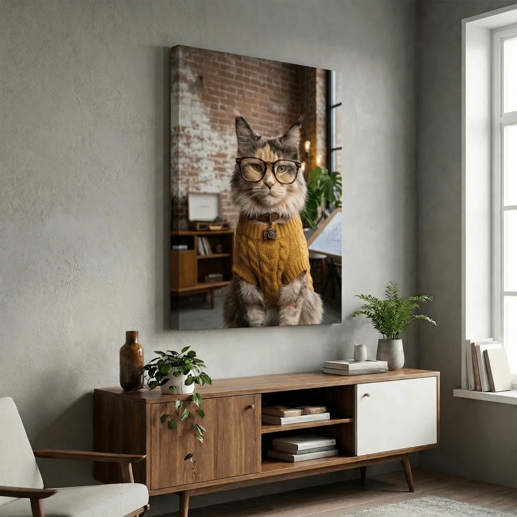 This striking realistic cat portrait captures fine fur textures and expressive eyes enhanced by tortoiseshell glasses and a cozy mustard knit sweater. A charming canvas print that brings personality and warmth to any room's wall art collection.