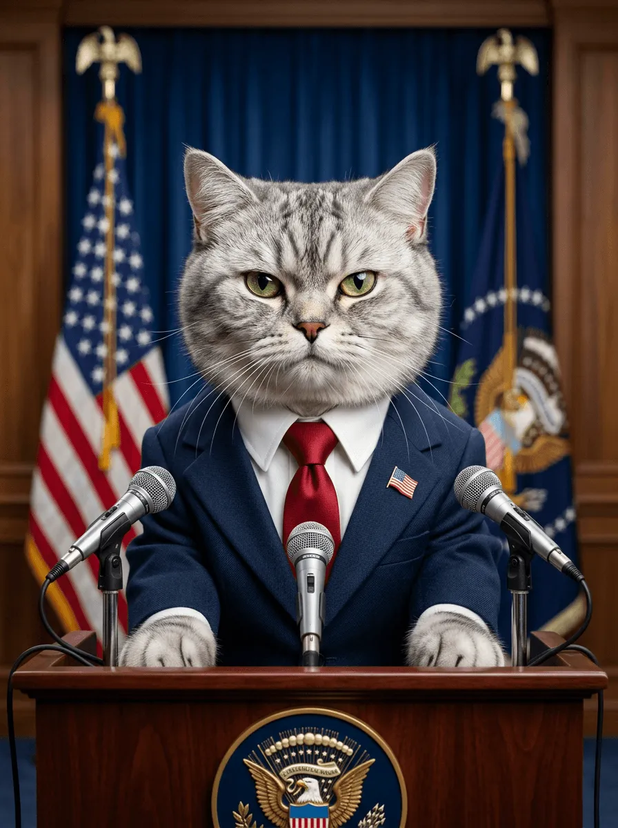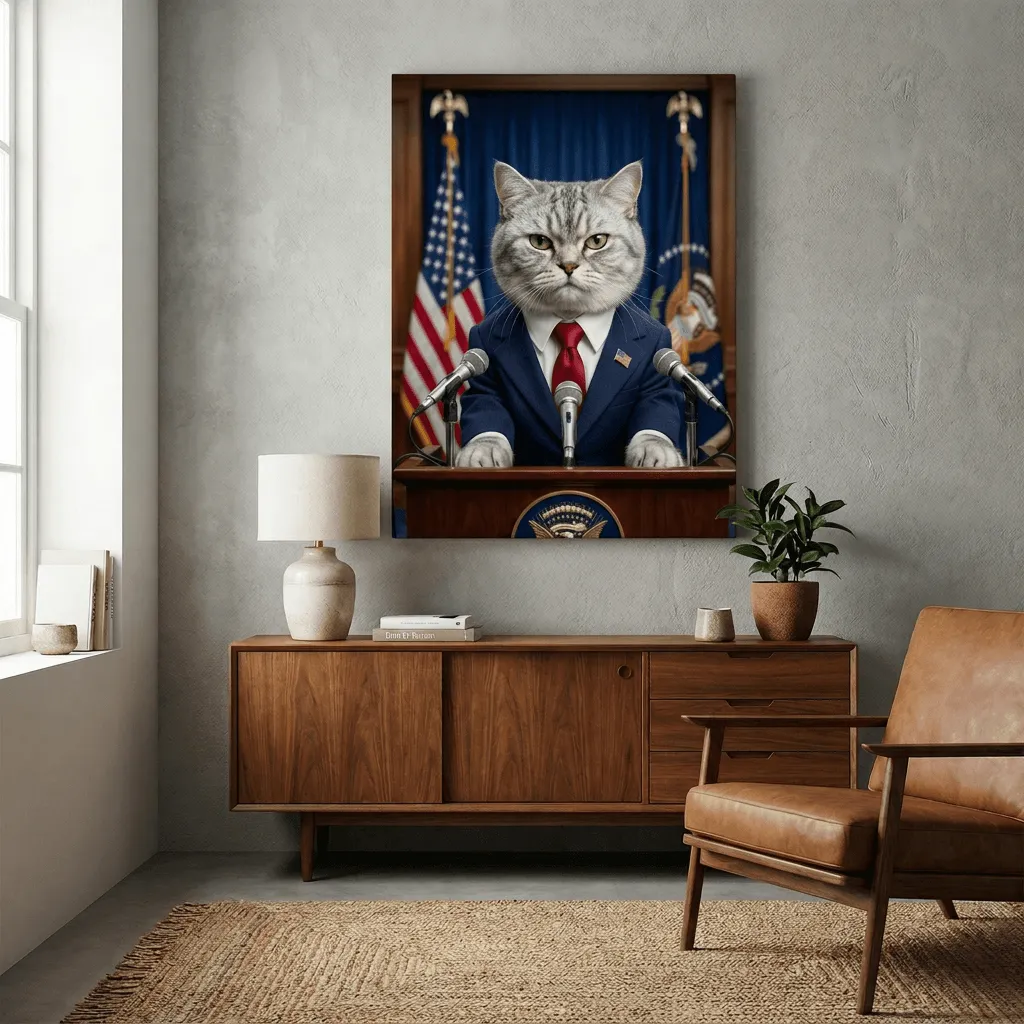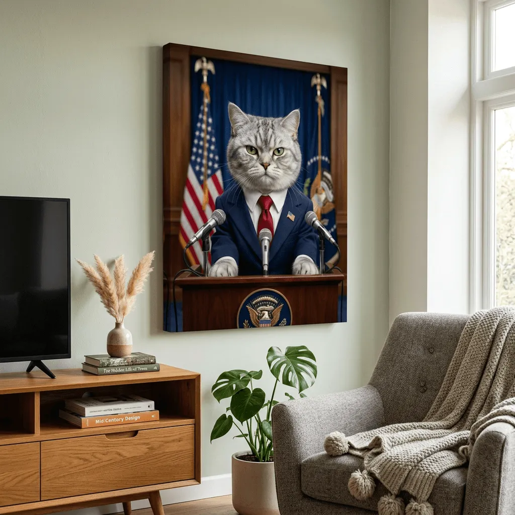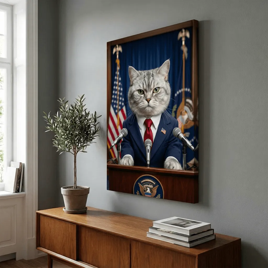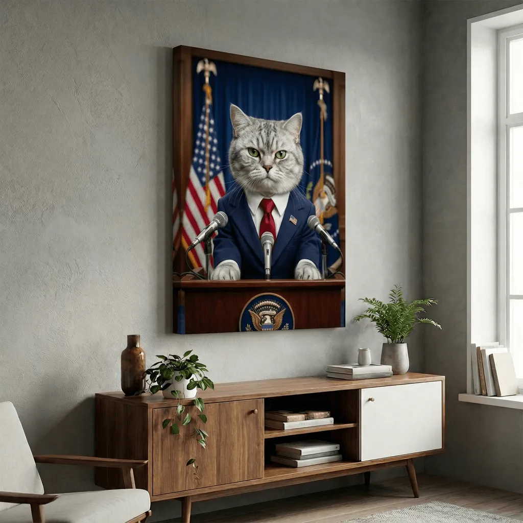 This striking realistic portrait renders a dignified gray tabby cat at the presidential podium, complete with formal navy suit, crimson tie, and official backdrop. A humorous yet meticulously detailed canvas print that brings whimsical charm and commanding presence to any room.