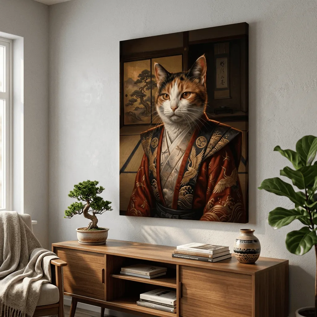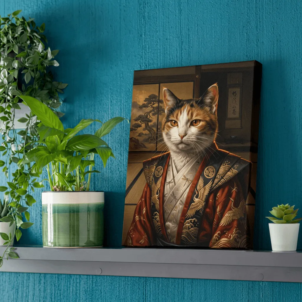 This striking realistic portrait features a dignified cat adorned in an ornate samurai robe with golden embroidered details and crimson silk. The lifelike rendering captures piercing amber eyes and intricate fur textures against a traditional Japanese interior backdrop, creating a bold canvas print that blends Eastern aesthetics with contemporary animal portraiture.