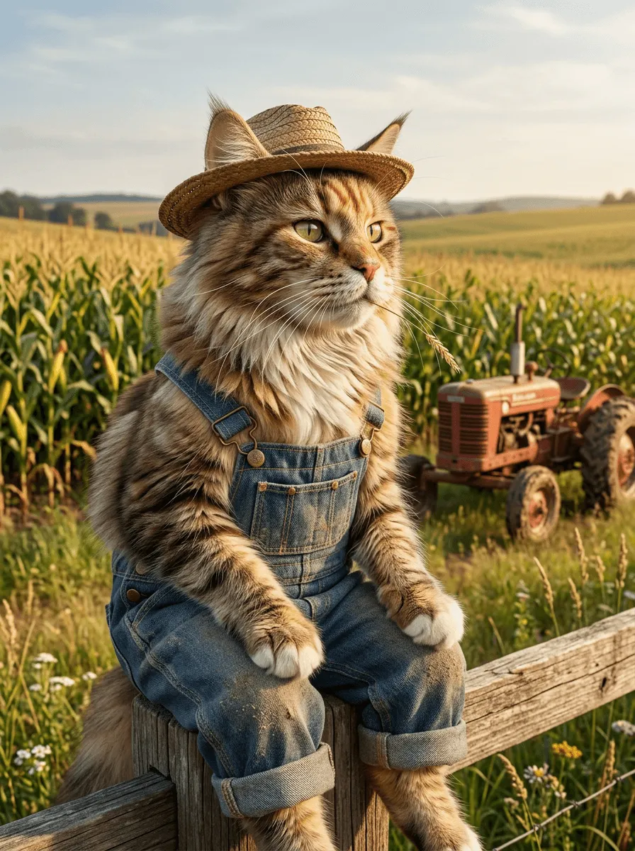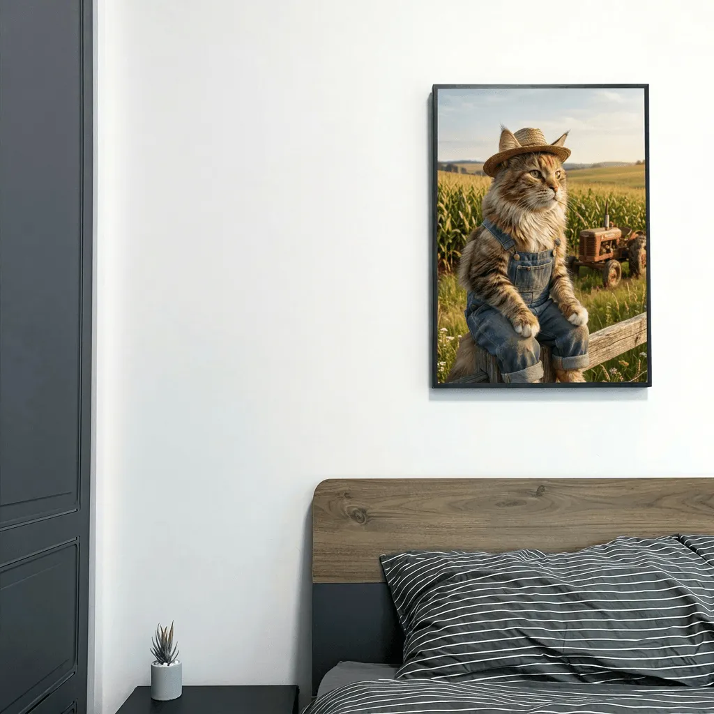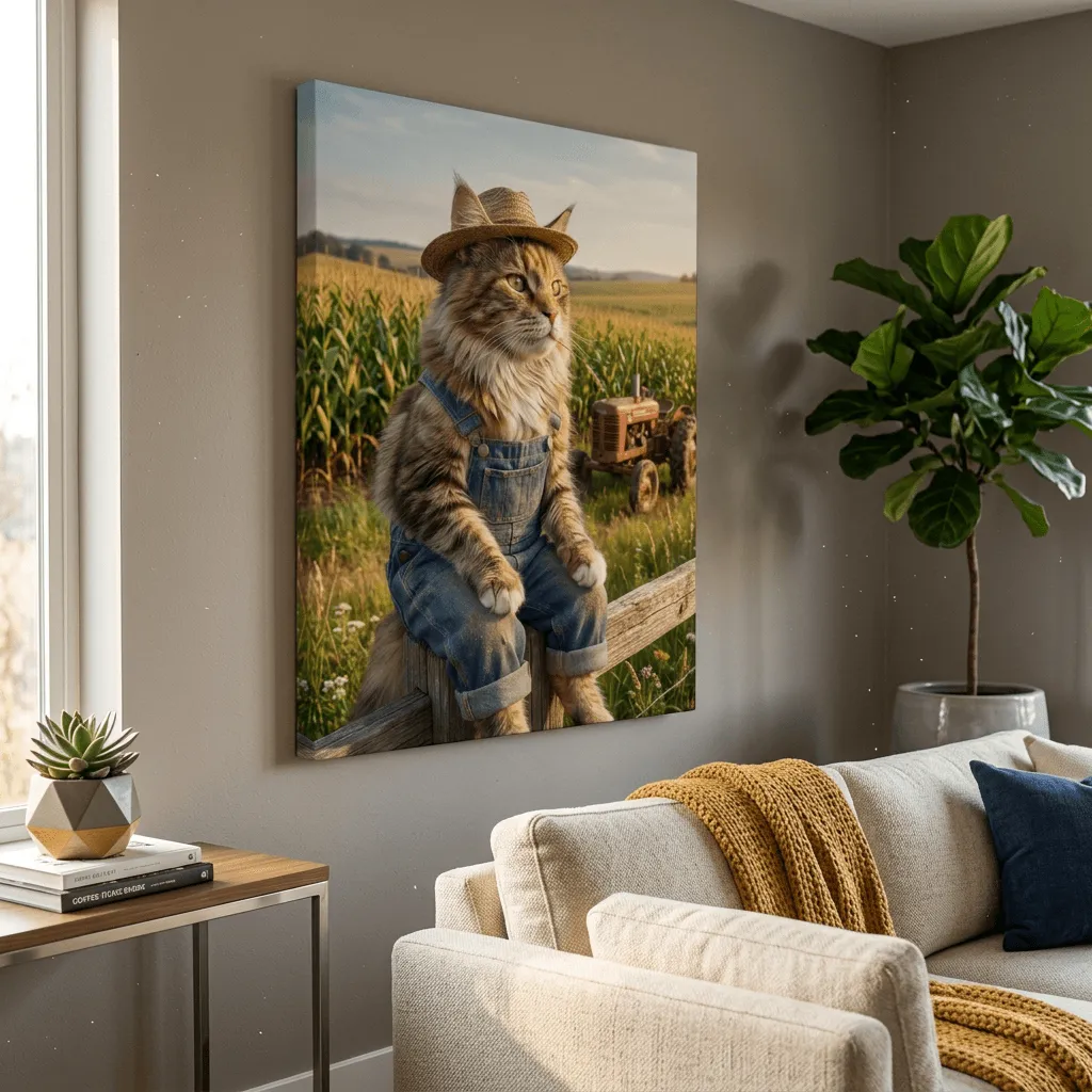 This striking realistic portrait captures a charming cat dressed as a cowboy in a rustic farmland setting. Rendered with photorealistic detail and warm natural lighting, the artwork brings humor and personality to any space. A whimsical canvas print perfect for pet lovers and farmhouse decor enthusiasts.