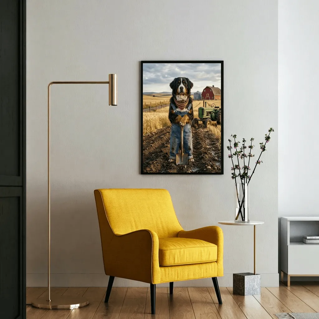 This photorealistic canvas print captures a charming Bernese Mountain Dog posed as a hardworking farmer, complete with denim overalls and red bandana. Rich detail and vibrant rural scenery create a whimsical yet lifelike wall art piece that brings personality and warmth to any space.