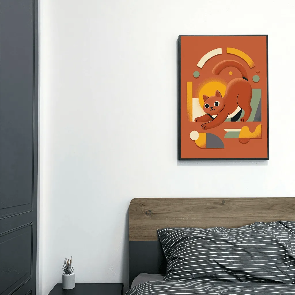 This striking retro Art Deco illustration features a playful ginger cat rendered in bold geometric shapes and warm amber tones. Perfect canvas print wall art that brings vintage charm and whimsical character to any room.