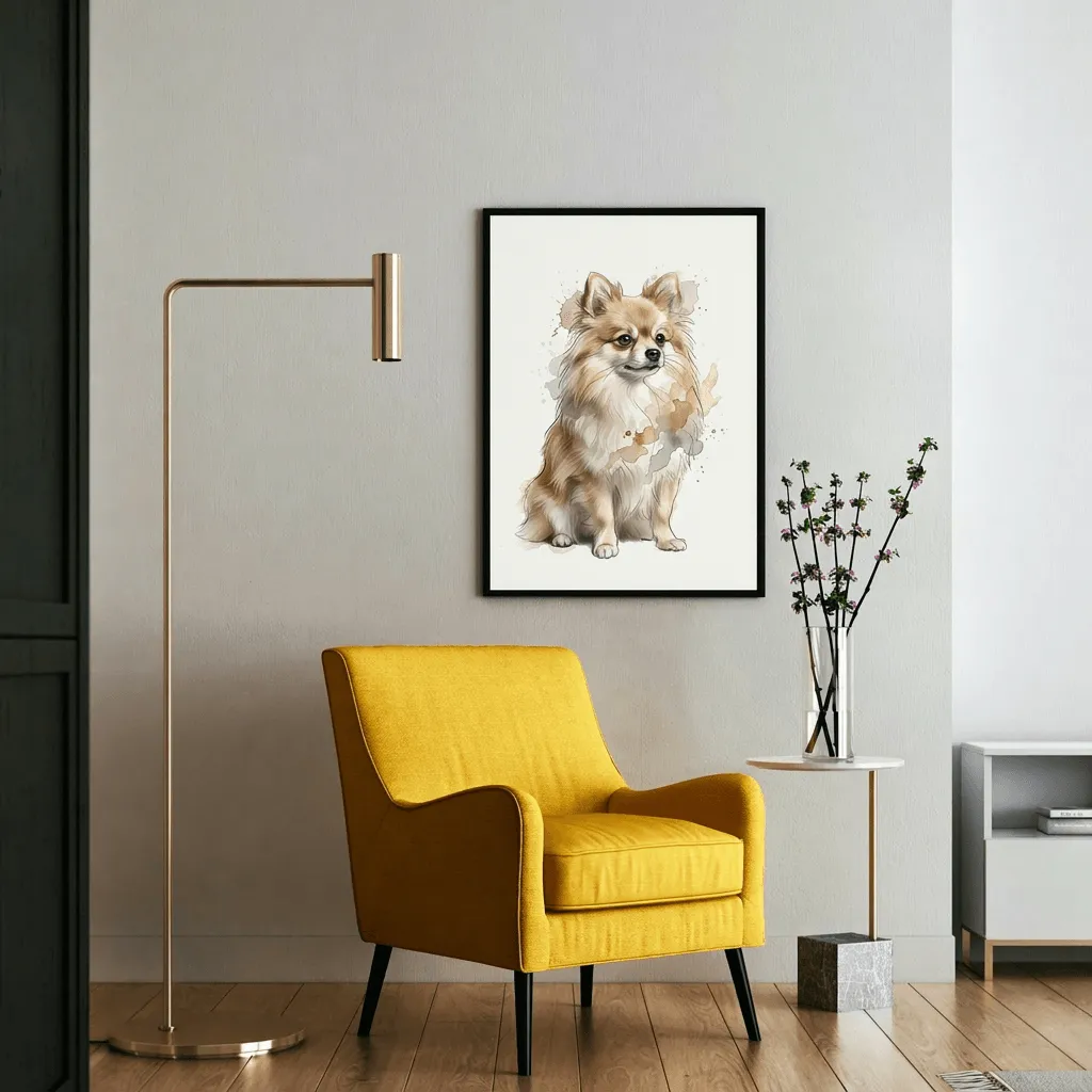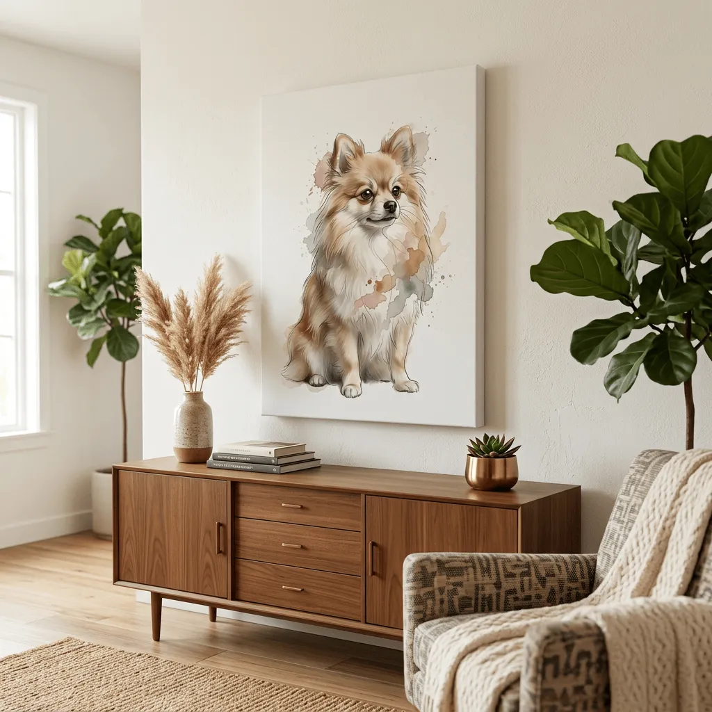 This delicate watercolor artwork captures a charming long-haired Chihuahua with soft pastel washes and artistic splashes. Perfect pet portrait canvas print that brings warmth and personality to any room with its gentle color palette and expressive detail.