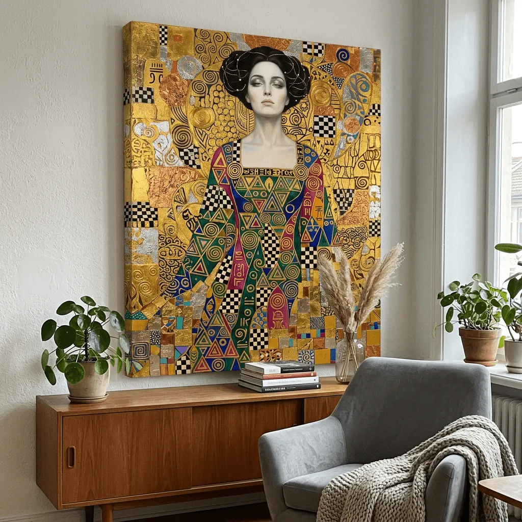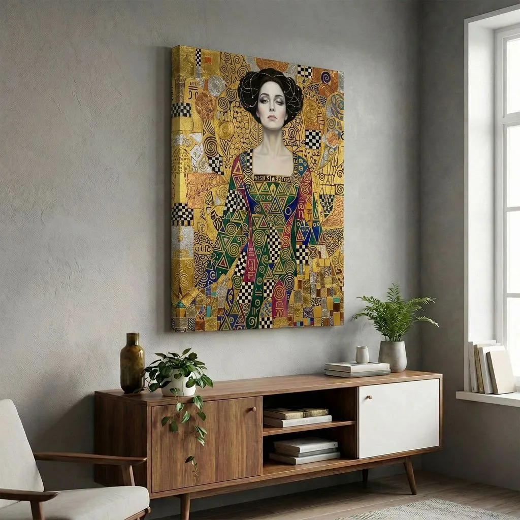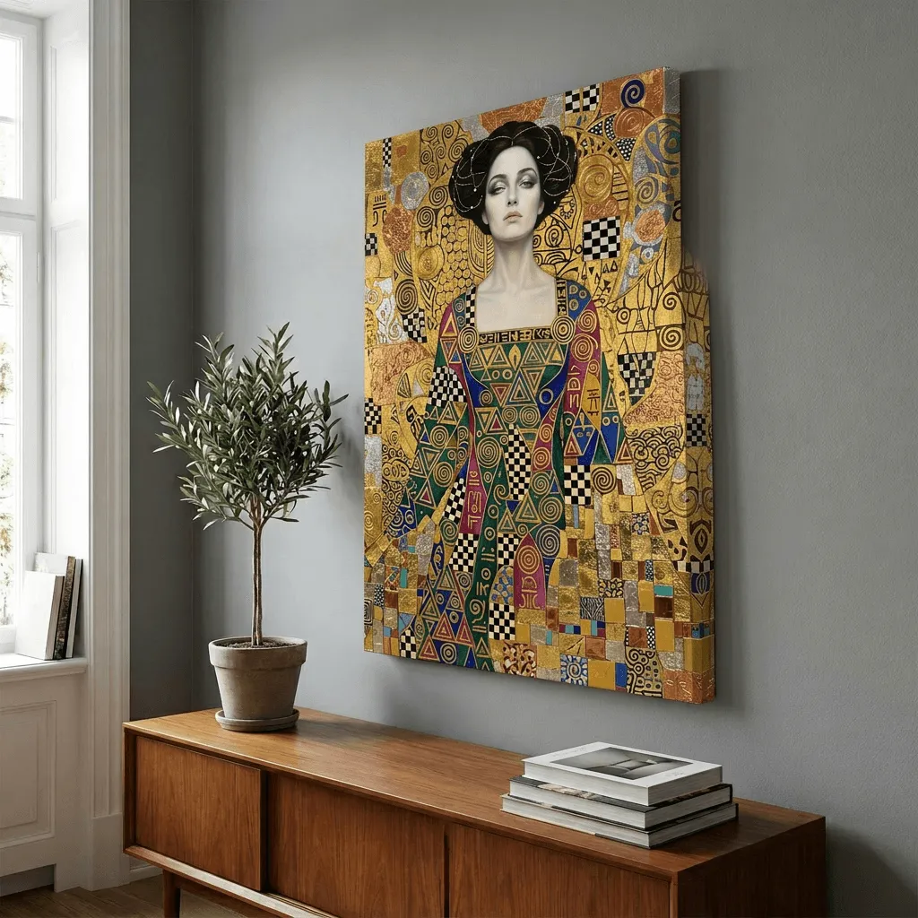 This striking digital art piece channels Gustav Klimt's iconic aesthetic with opulent gold leaf textures, intricate geometric patterns, and ornamental details. The sophisticated updo hairstyle and jewel-toned embellished gown create a luxurious, gallery-worthy canvas print perfect for elegant living spaces and statement walls.