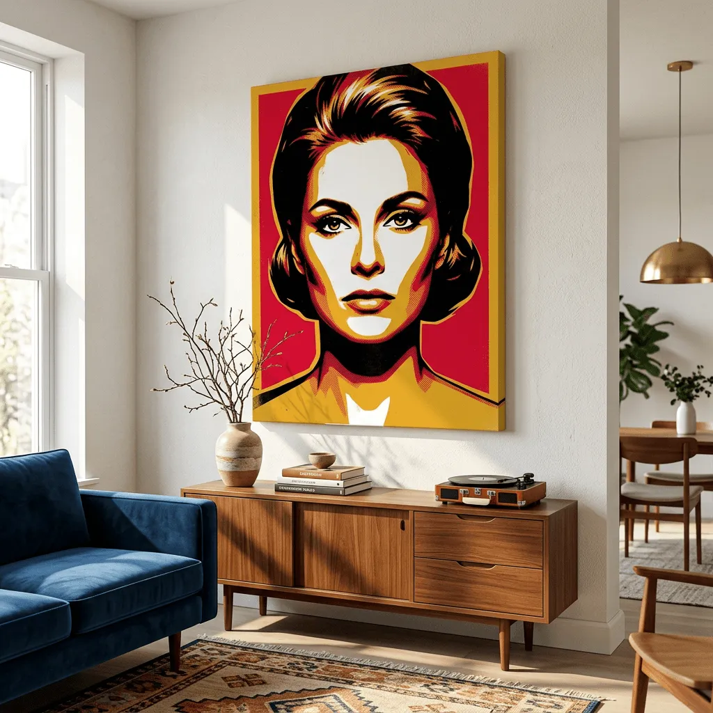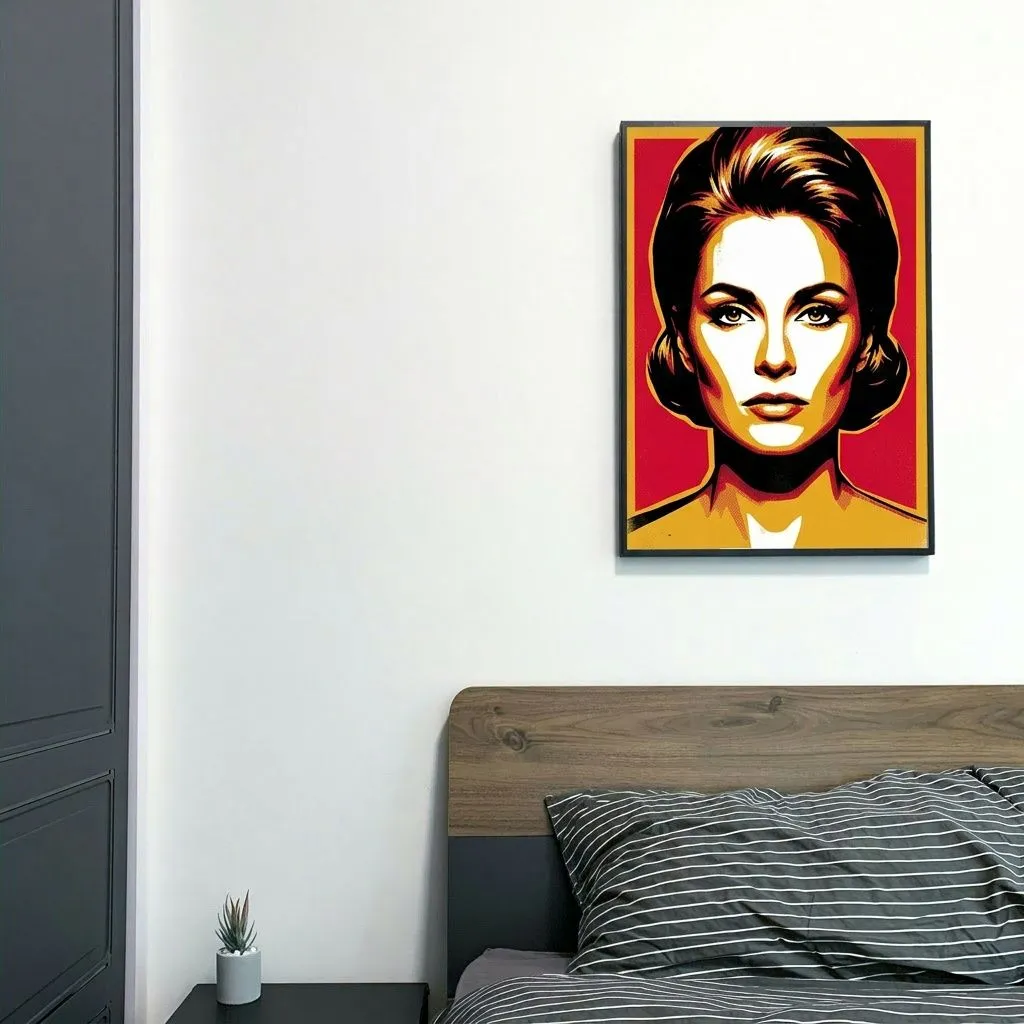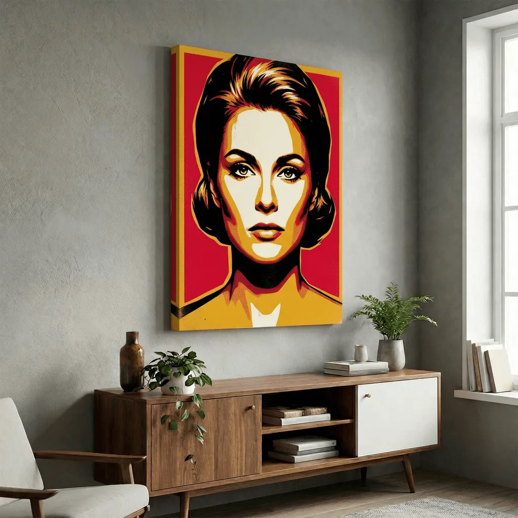 A striking pop art portrait rendered in vibrant red, gold, and black with bold halftone textures. This contemporary canvas print captures the iconic style of 1960s pop art, featuring dramatic color blocking and high-contrast features that make a powerful statement in any modern living space.