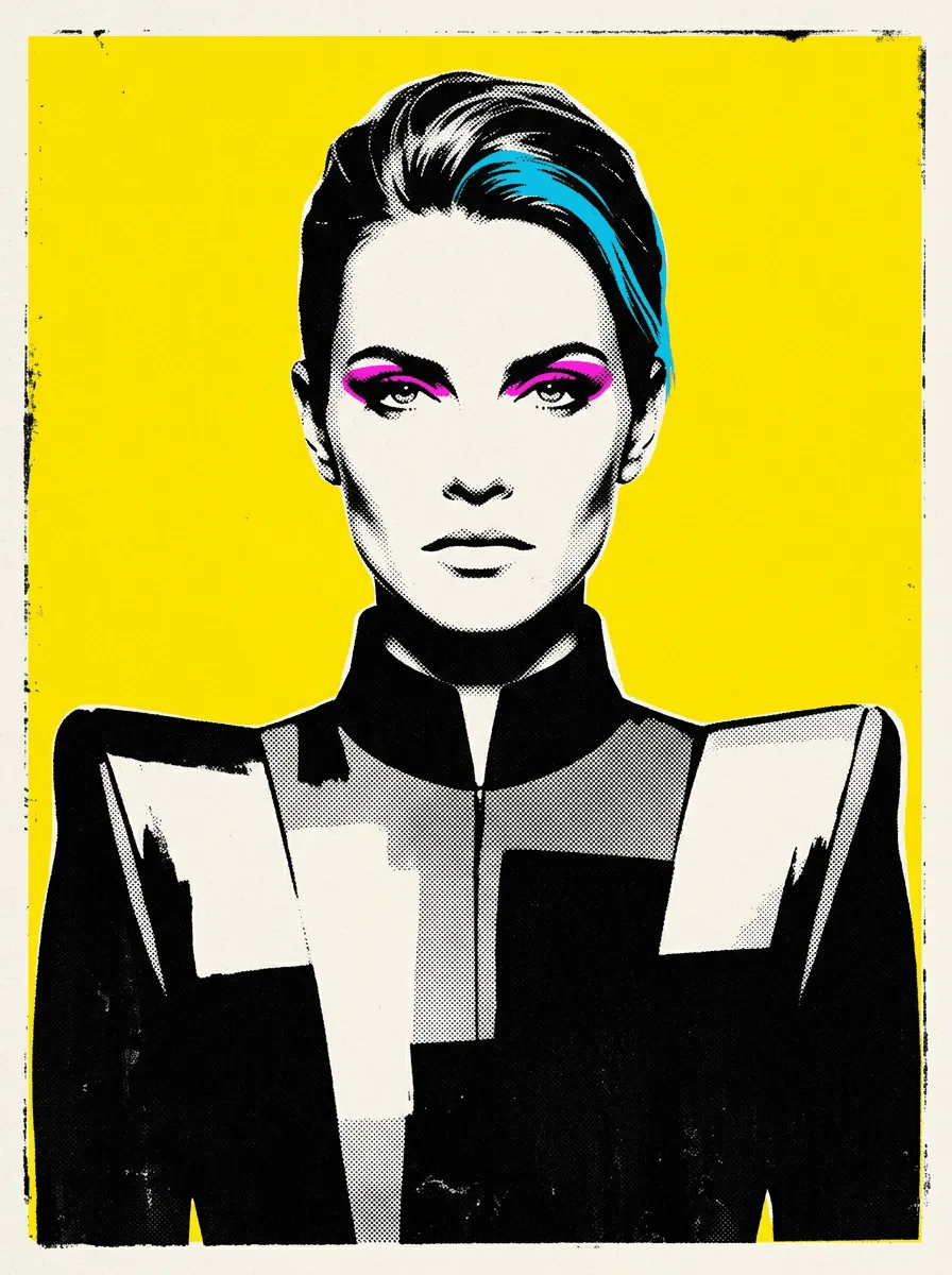 This striking pop art portrait features bold magenta eyeshadow and electric blue hair accents against a vibrant yellow background. High-contrast black and white halftone technique creates a magazine-cover aesthetic perfect for modern wall art that commands attention in any contemporary space.