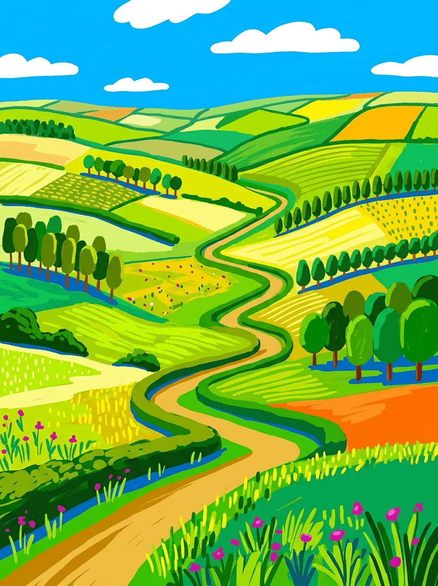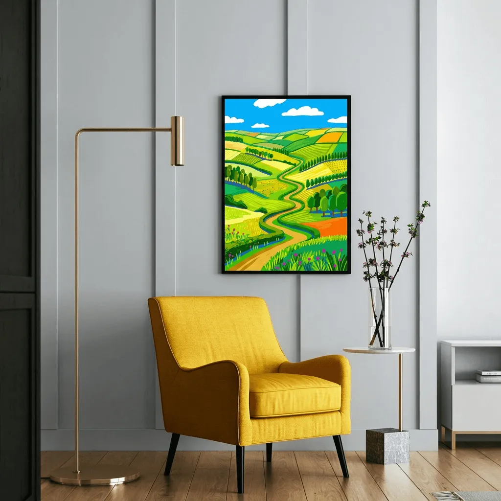 Rendered in bold pop art style with striking lime greens, golden yellows, and electric blues, this landscape features rolling hills and winding rivers. A vibrant canvas print that brings contemporary energy and cheerful sophistication to any living space or farmhouse décor.