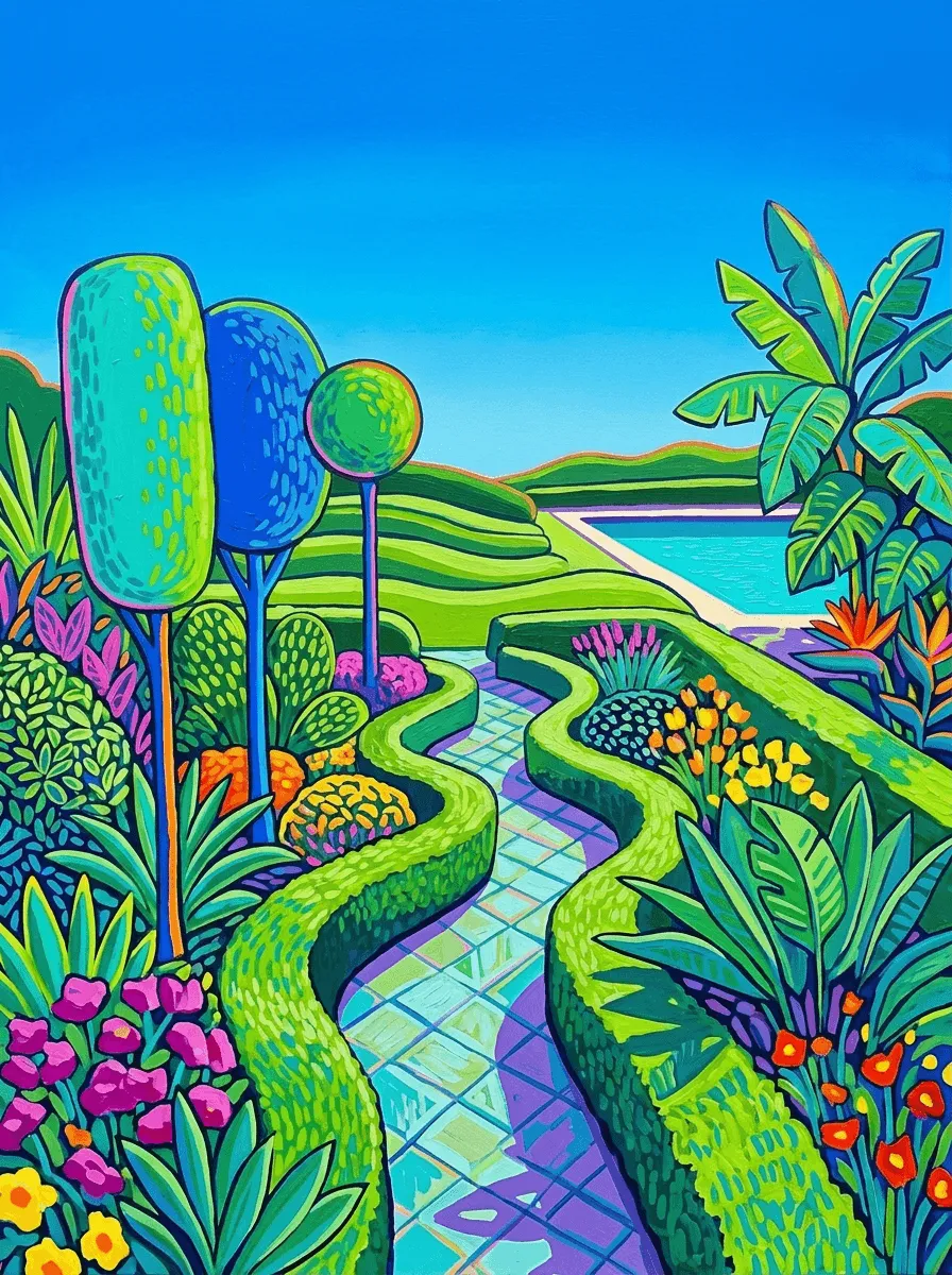 This vibrant pop art landscape bursts with neon greens, magentas, and electric blues. Bold outlined botanical forms and a winding pathway lead to serene water views, creating a striking contemporary canvas print perfect for modern living spaces and creative offices.