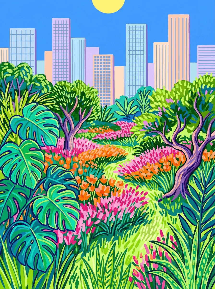 Vibrant pop art illustration featuring bold neon colors, tropical foliage, and a stylized pastel skyline. This eye-catching canvas print blends nature with urban architecture in a contemporary, energetic composition perfect for modern living spaces.