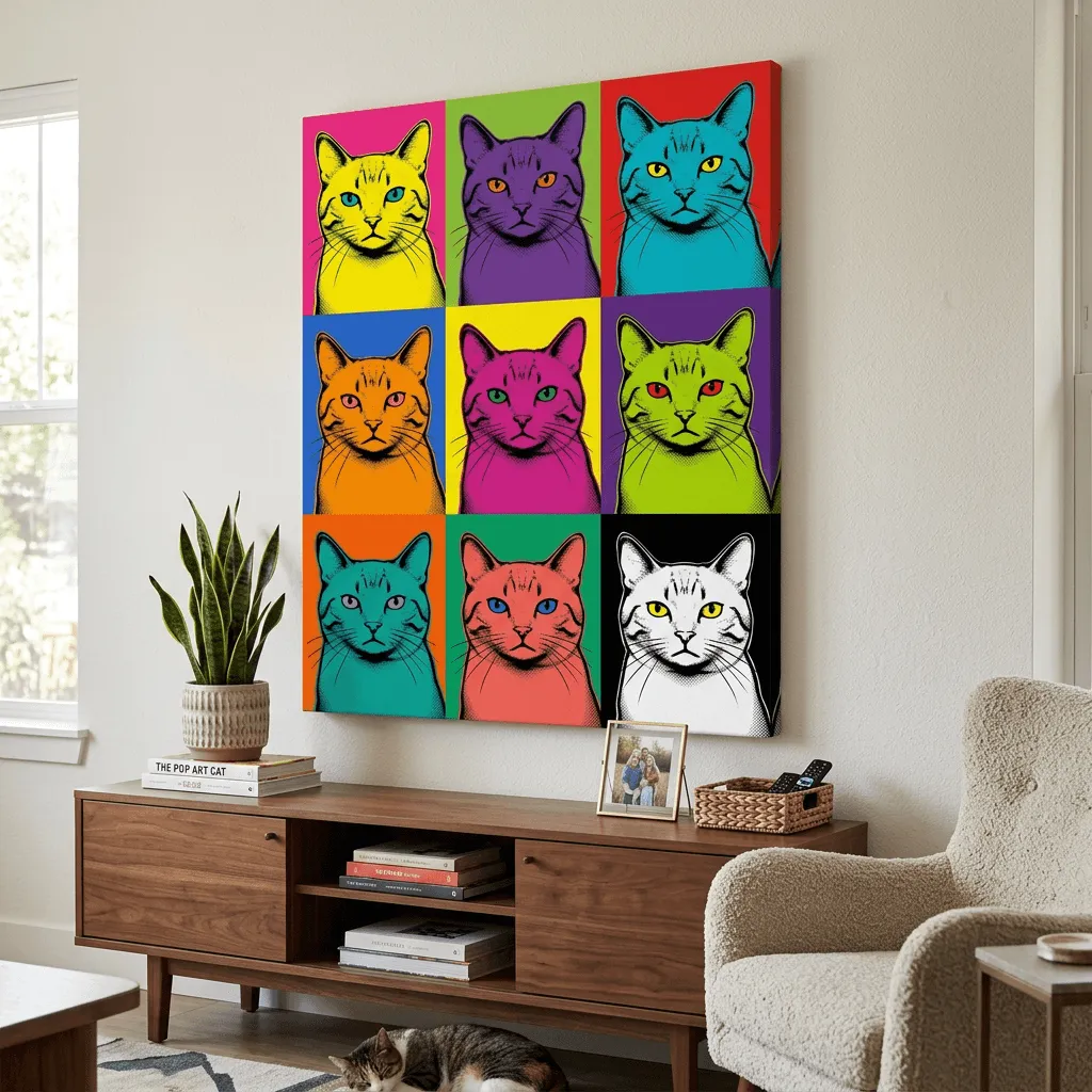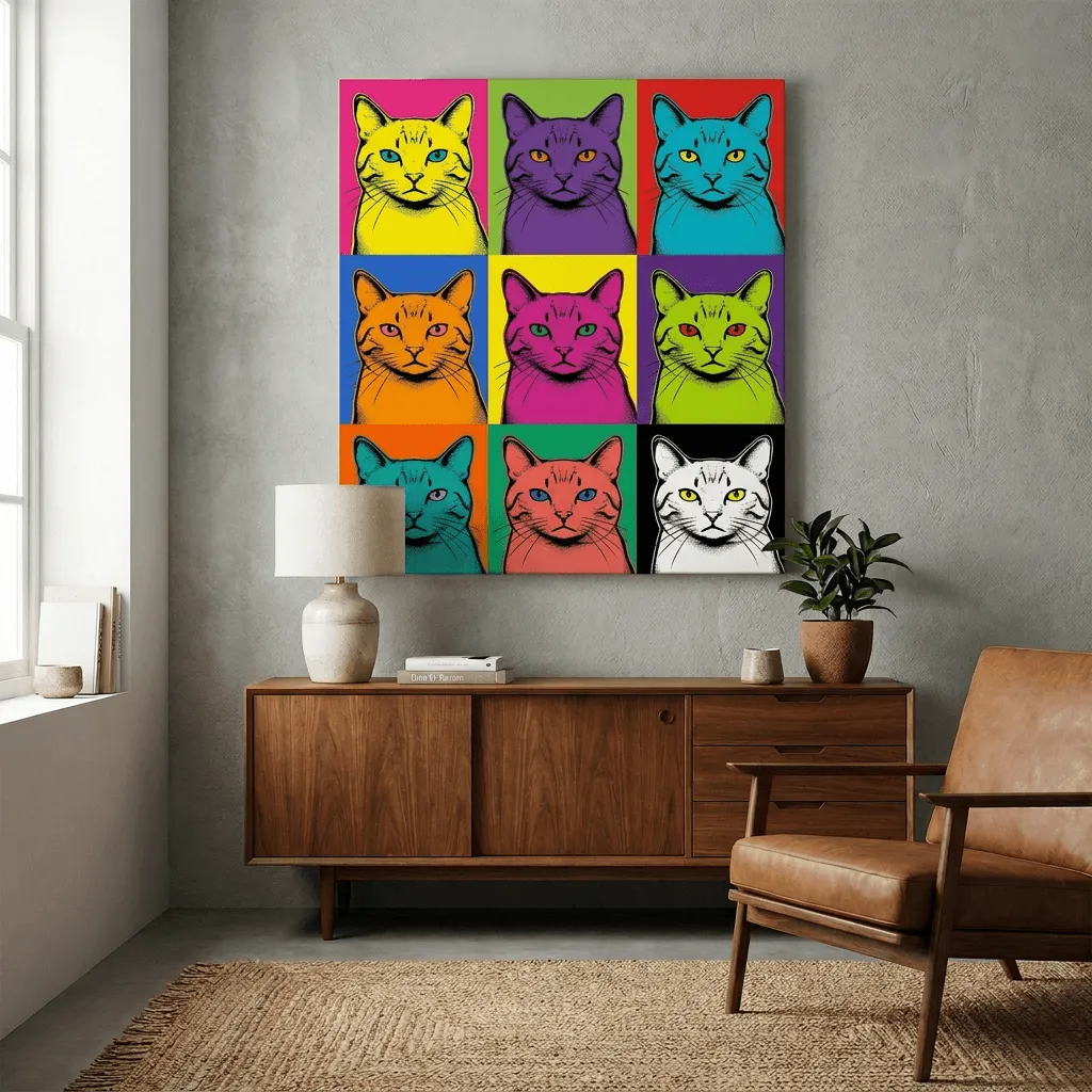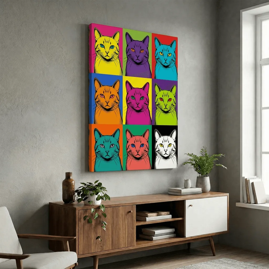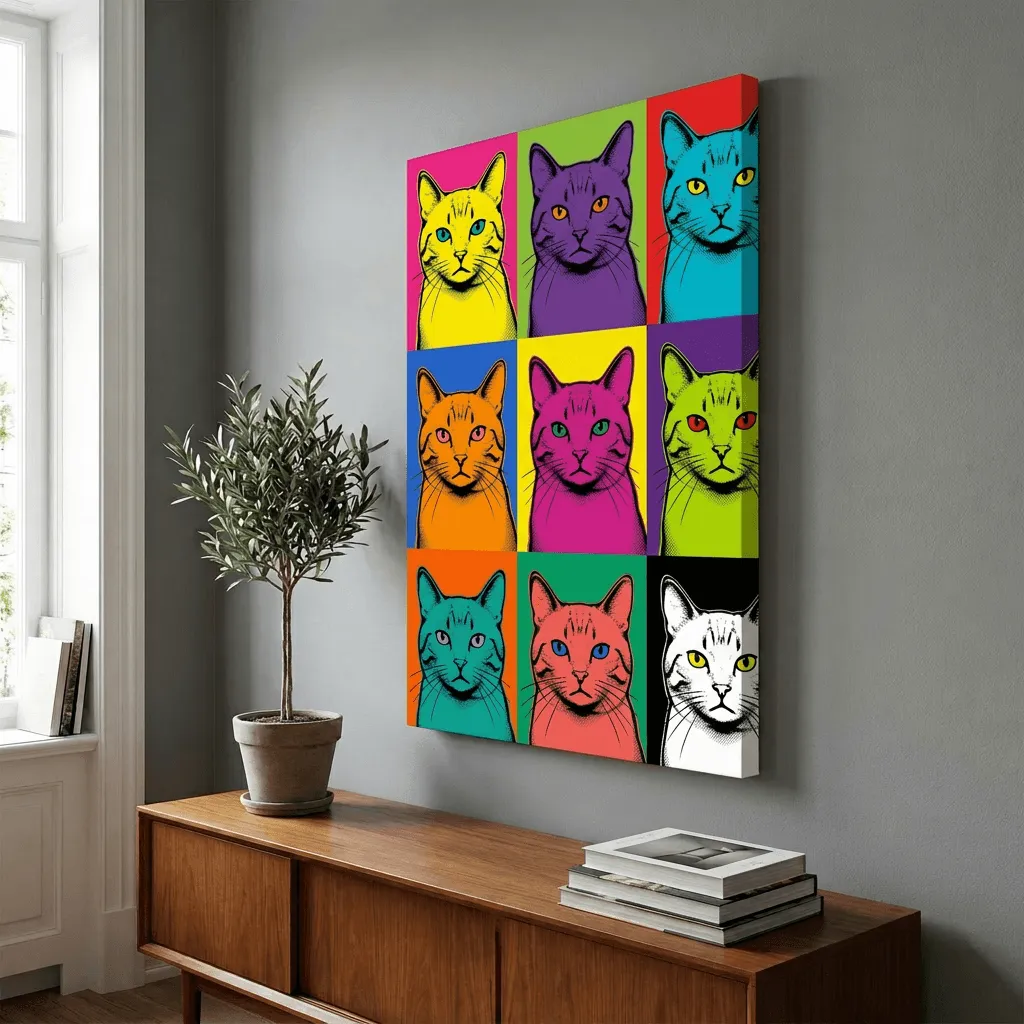 Bold pop art style featuring a striking nine-panel cat grid in vibrant neon colors. This eye-catching canvas print combines halftone ink line work with electric color blocking, perfect for modern living spaces and contemporary home decor.