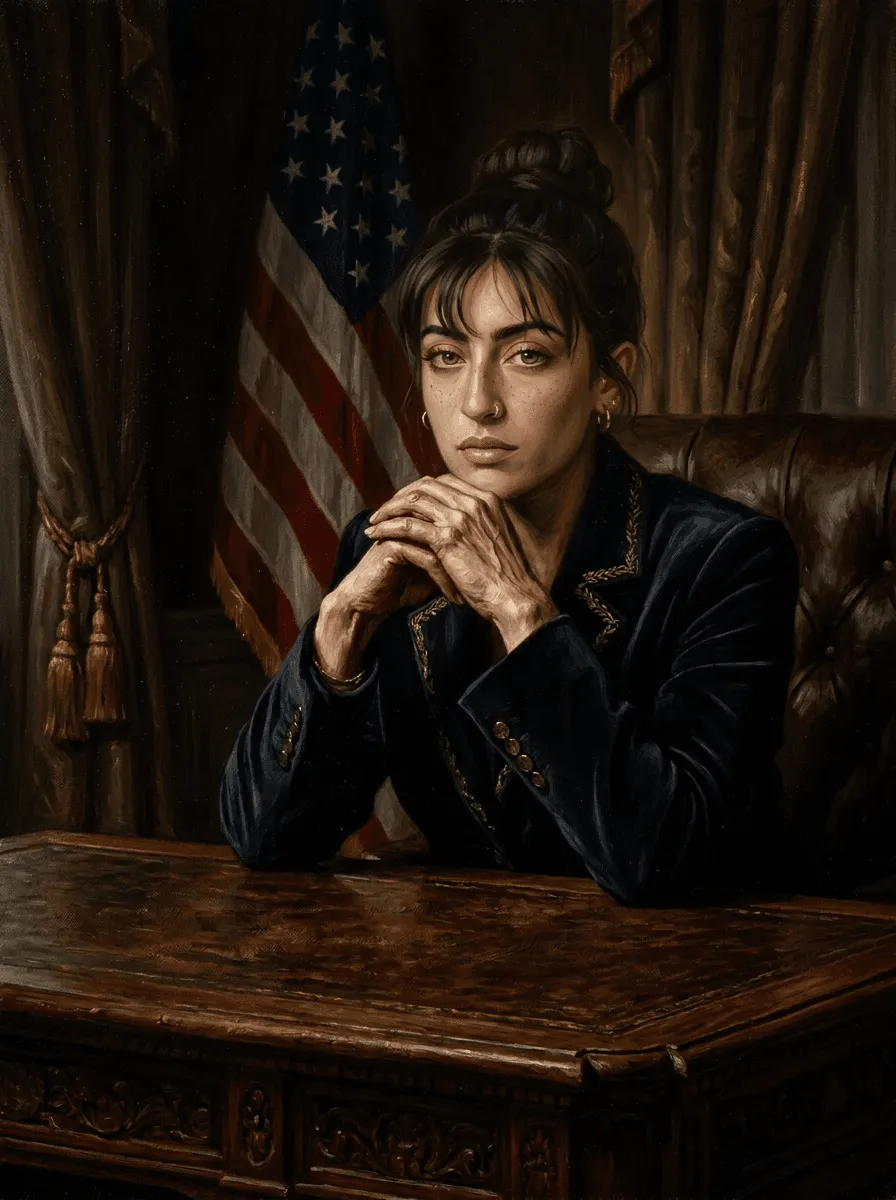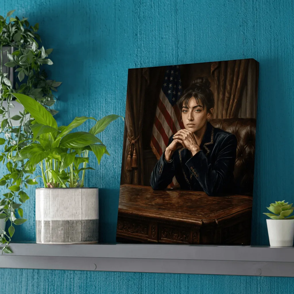 Rendered in rich oil paint with masterful light and shadow, this striking executive portrait captures contemplative strength at the desk. The deep navy blazer, gold embroidery details, and American flag backdrop create an authoritative canvas print perfect for offices, studies, and professional spaces.