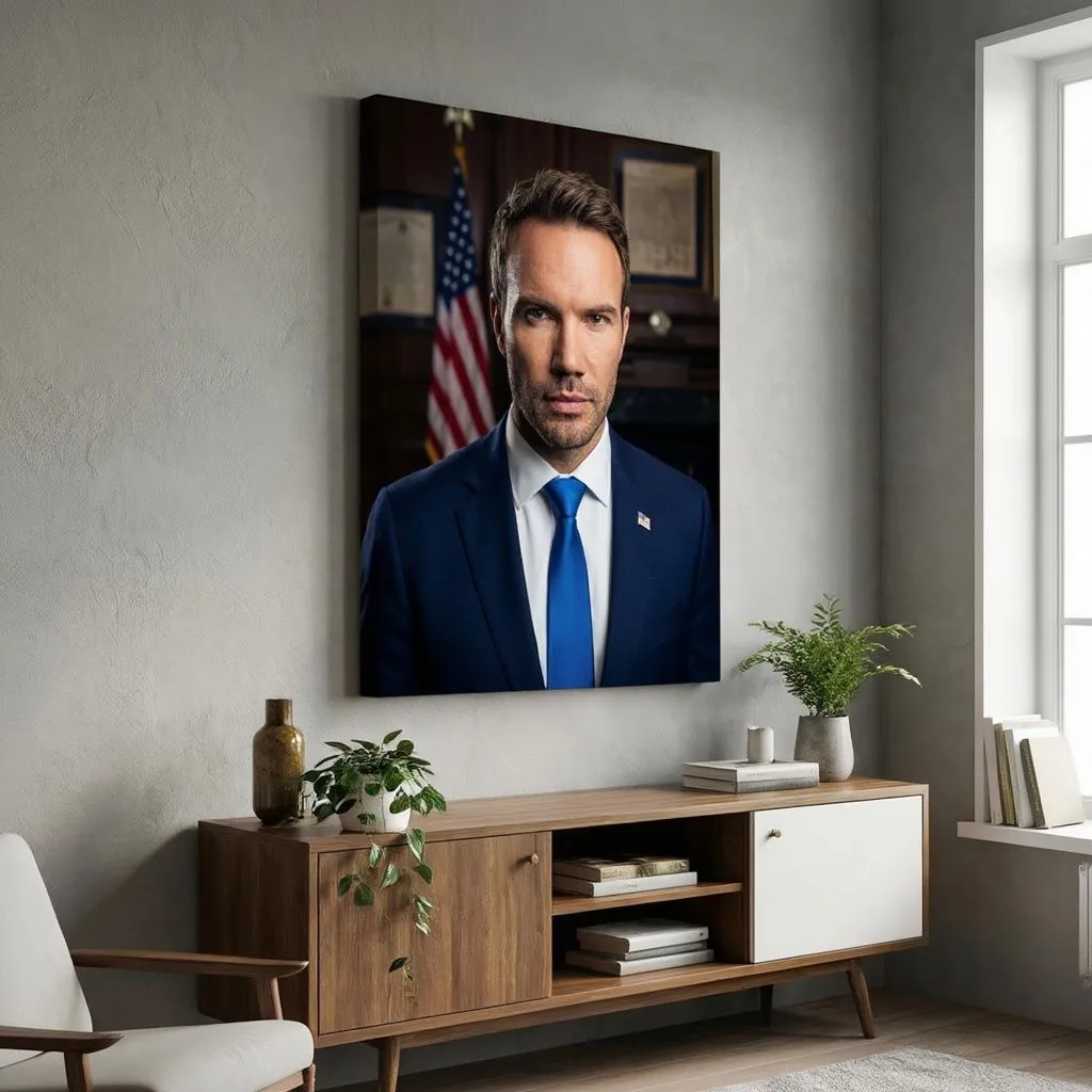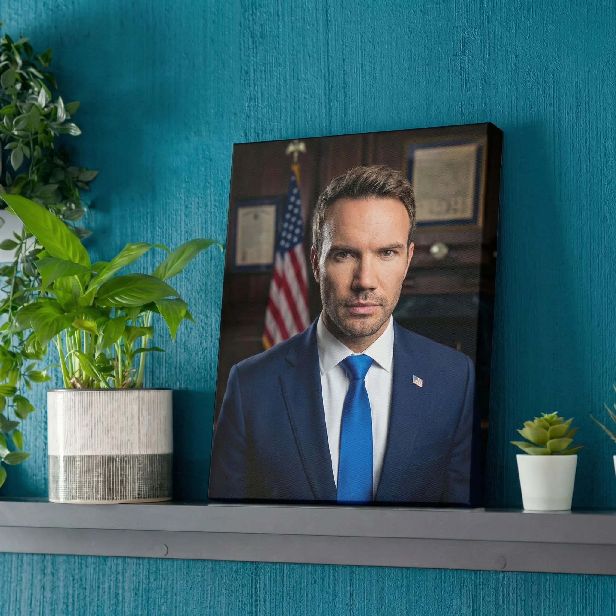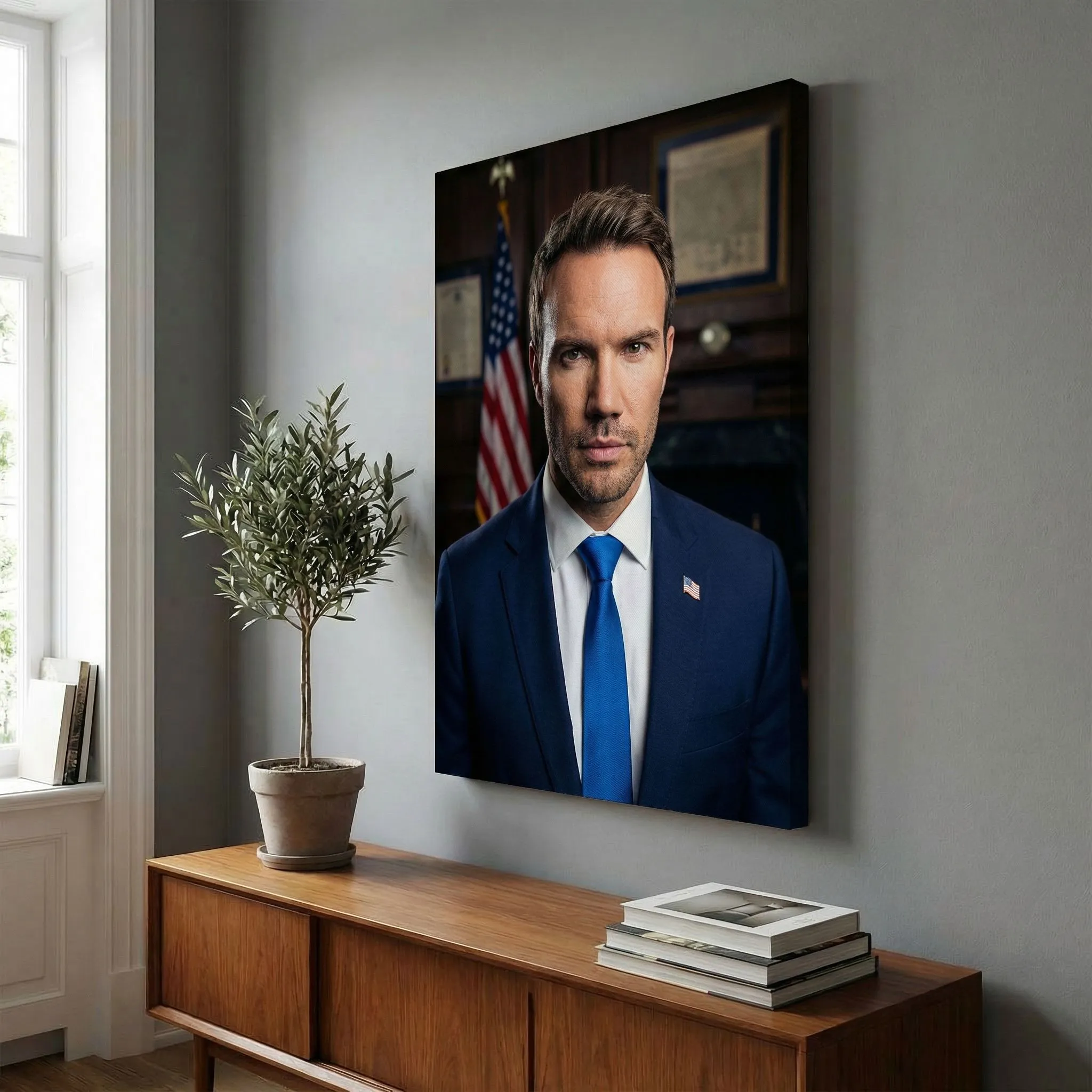 This photorealistic portrait captures striking detail with professional lighting and composition. Set against an official office backdrop with American flag, it's an ideal canvas print for executive spaces, corporate offices, or formal home décor.