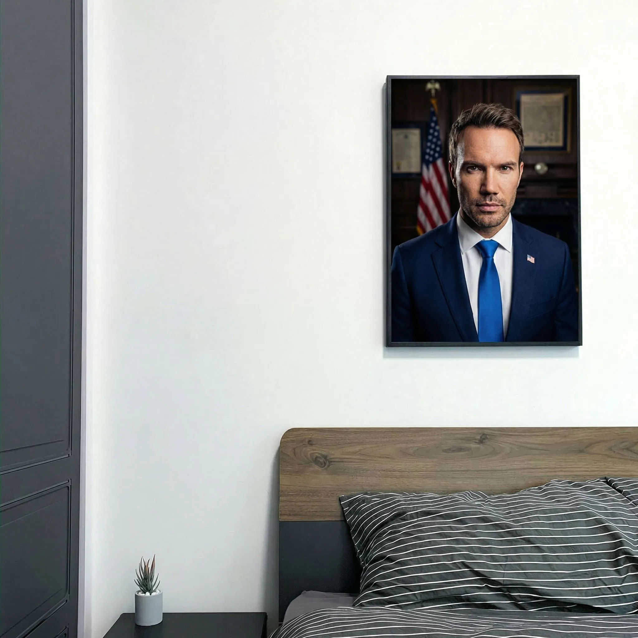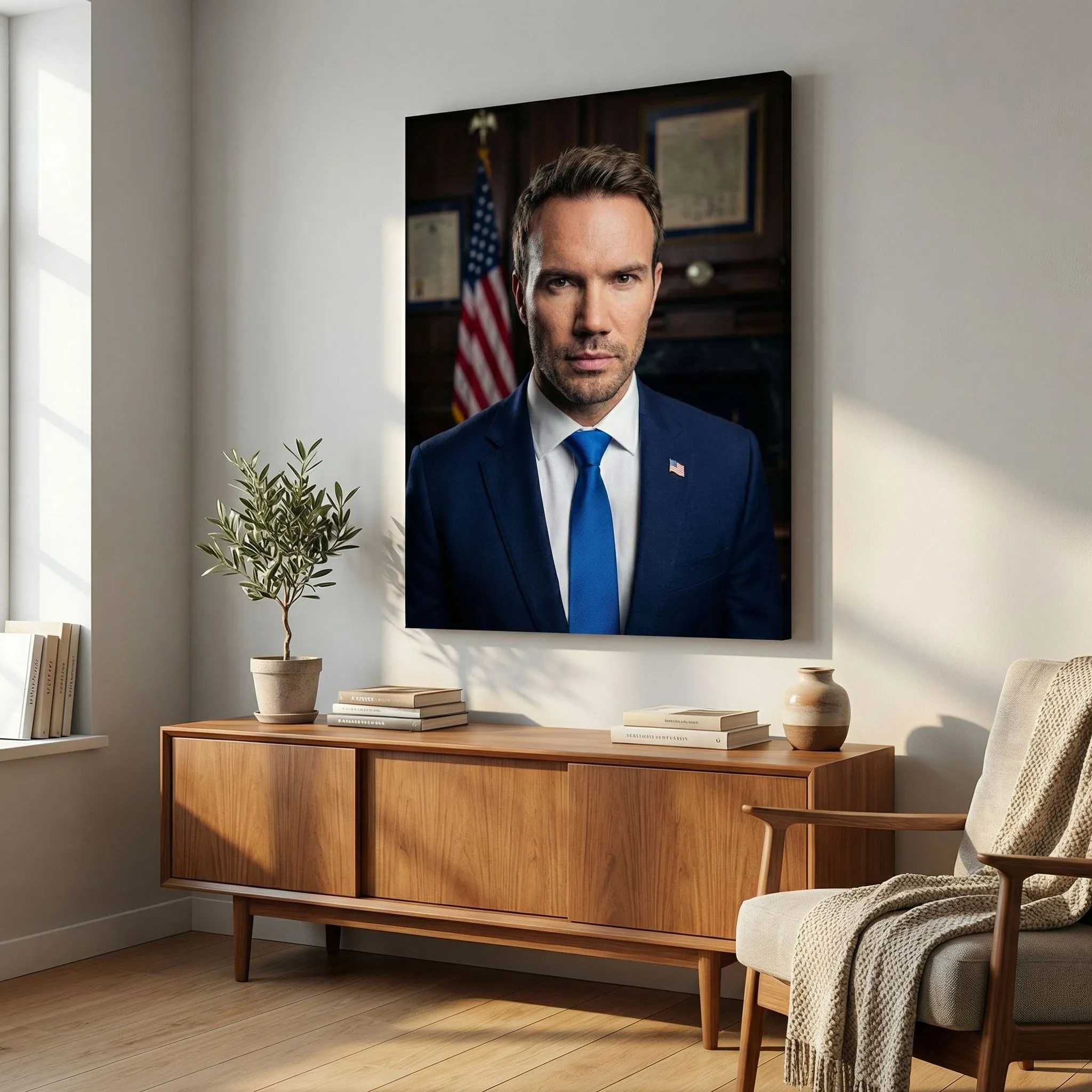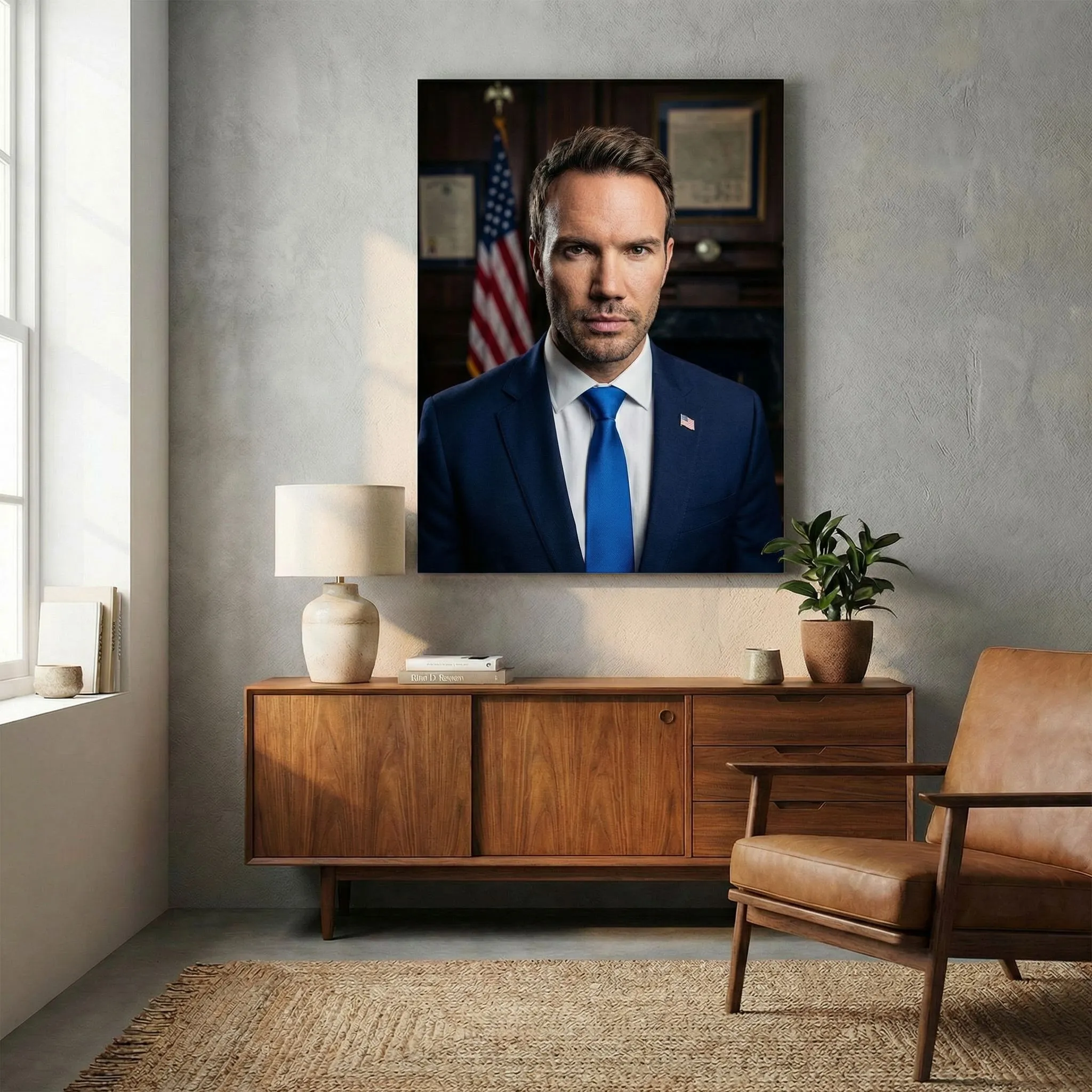 This photorealistic portrait captures striking detail with professional lighting and composition. Set against an official office backdrop with American flag, it's an ideal canvas print for executive spaces, corporate offices, or formal home décor.
