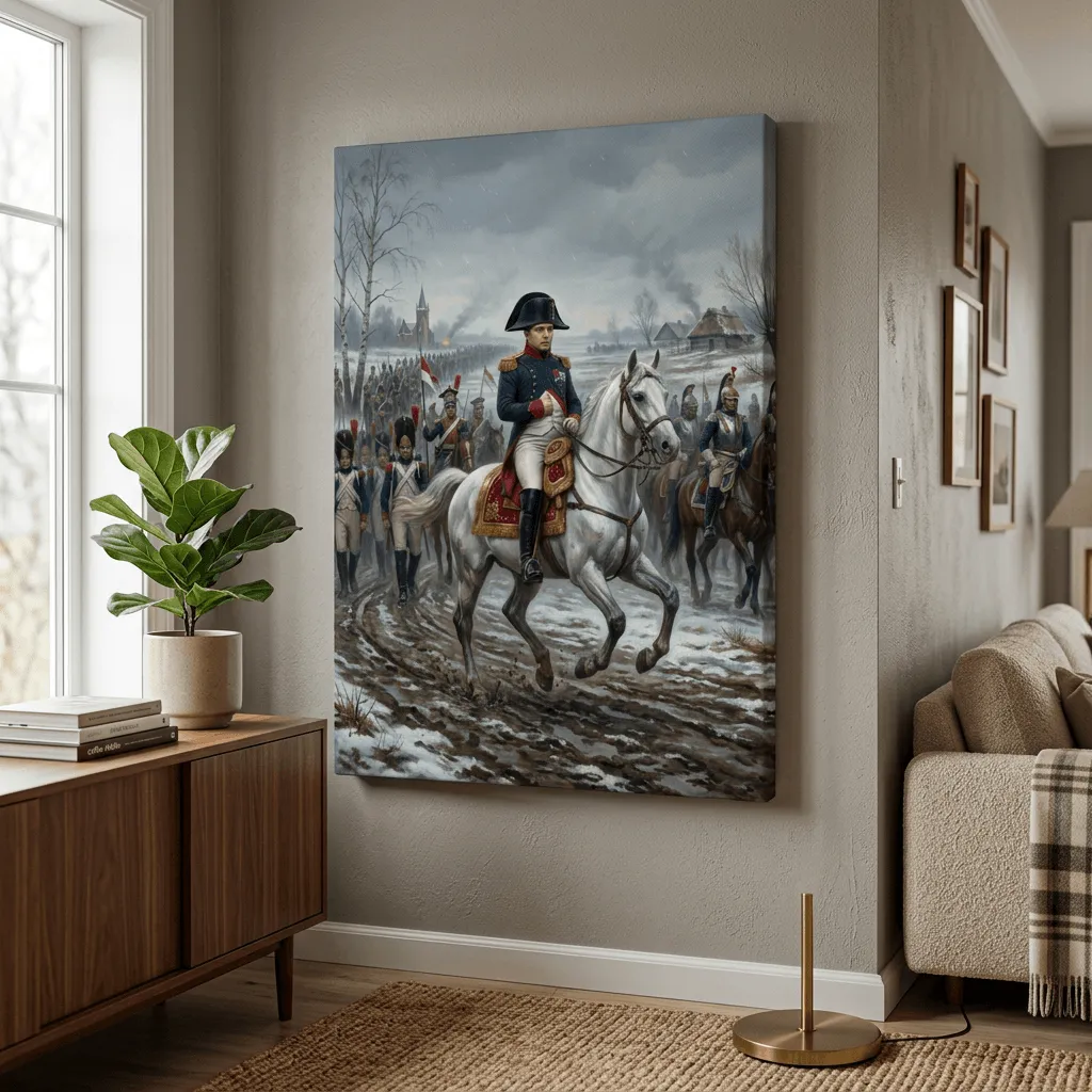 This striking oil painting captures a Napoleonic military commander astride a magnificent white horse amid a snow-covered battlefield. Rendered with rich, classical oil paint techniques and meticulous historical detail, the composition features ornate military regalia, golden epaulettes, and dramatic winter scenery. A commanding canvas print perfect for study, library, or executive spaces.
