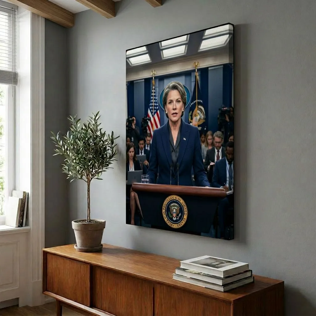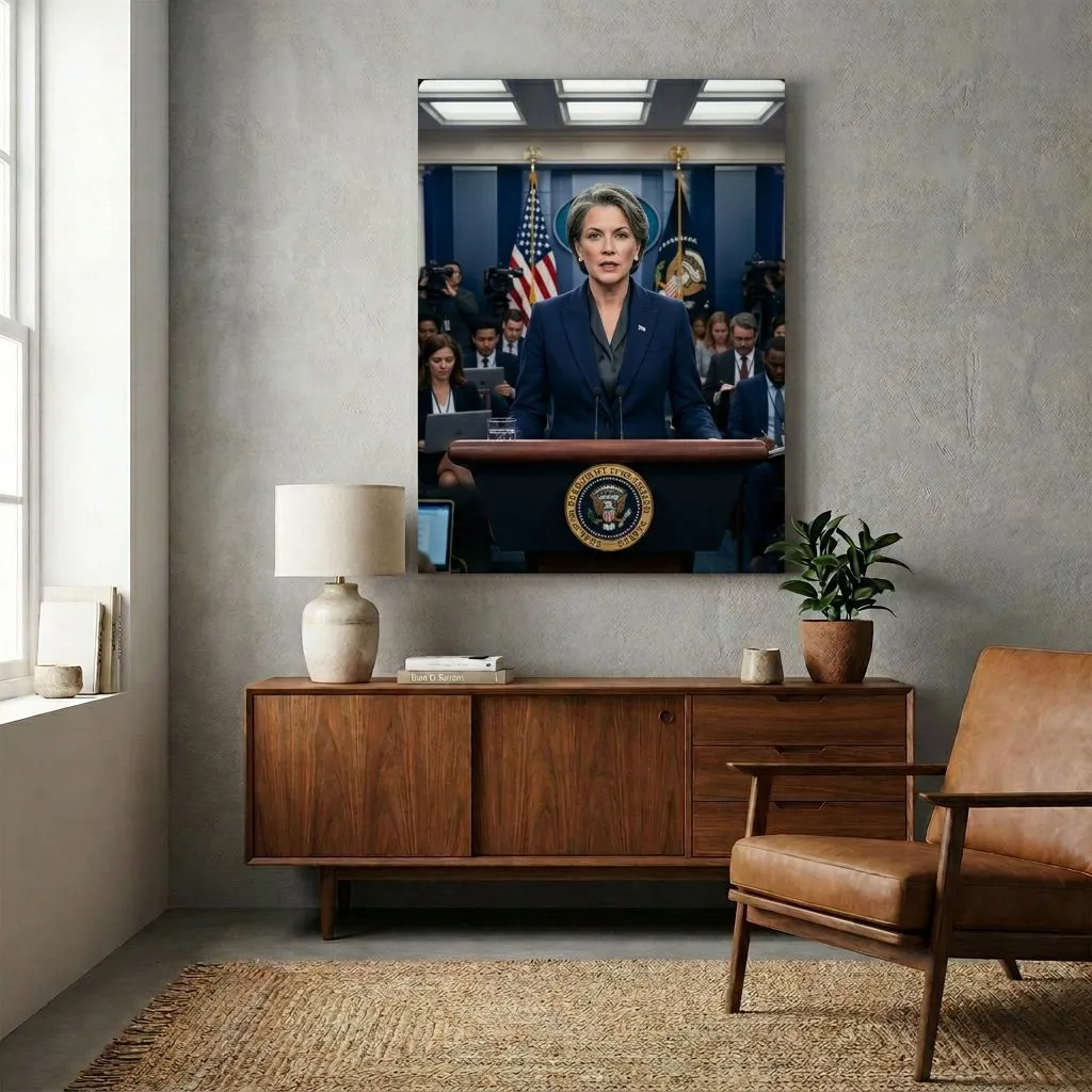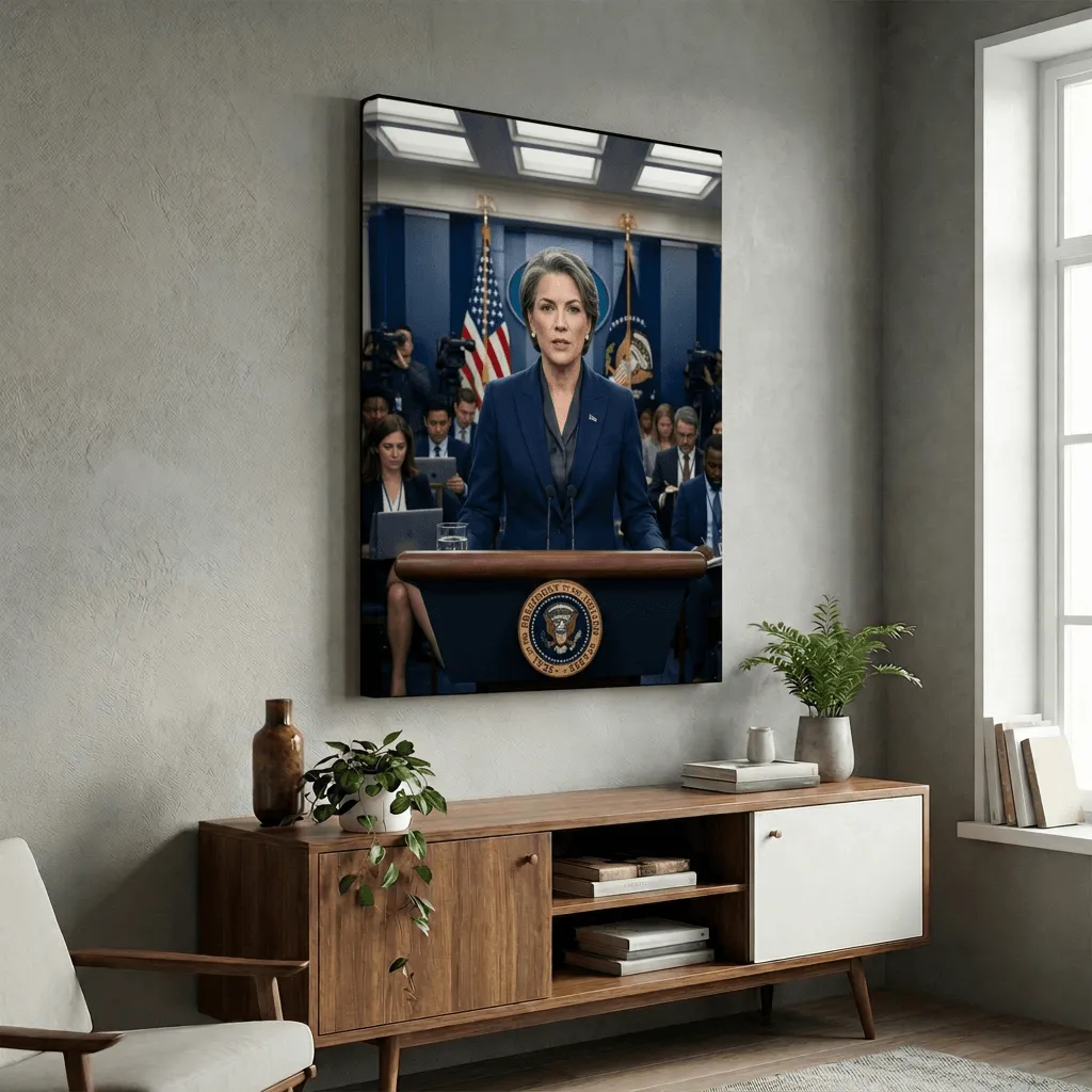 This striking realistic portrait captures a powerful moment at the presidential podium with photorealistic detail and professional lighting. The formal composition features an American flag backdrop and official setting, making it an impactful canvas print for executive offices or statement wall decor.