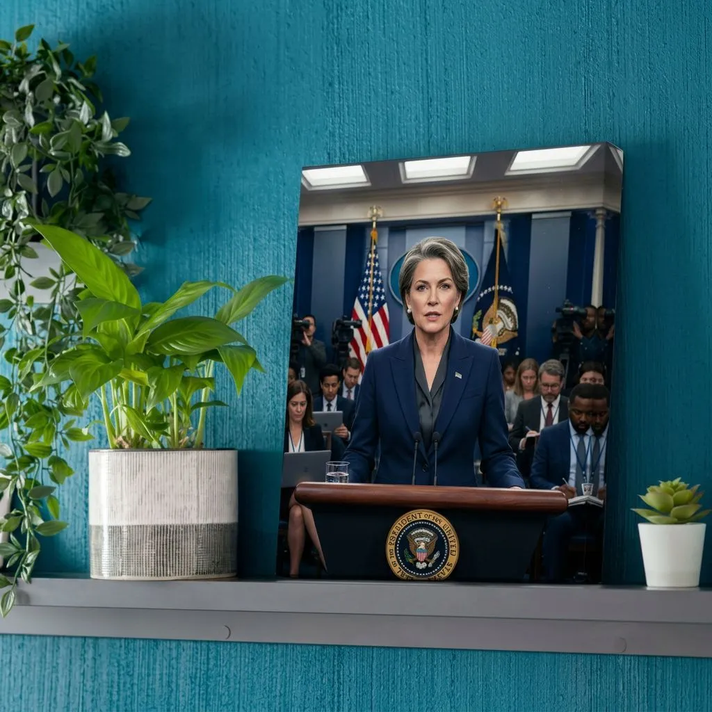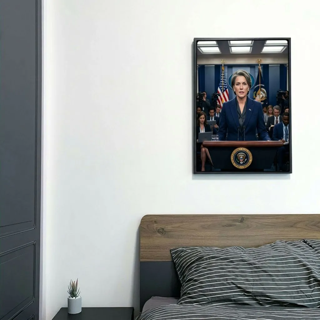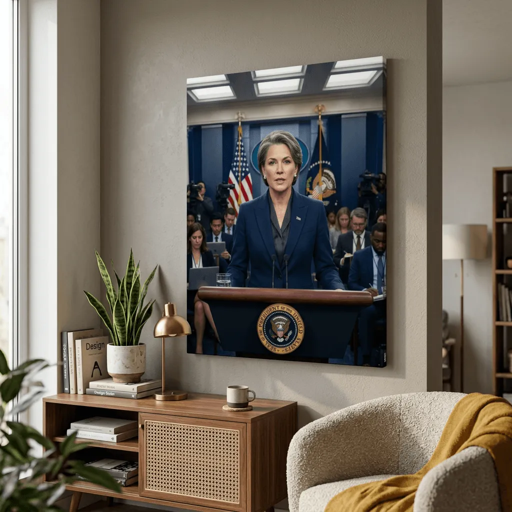 This striking realistic portrait captures a powerful moment at the presidential podium with photorealistic detail and professional lighting. The formal composition features an American flag backdrop and official setting, making it an impactful canvas print for executive offices or statement wall decor.