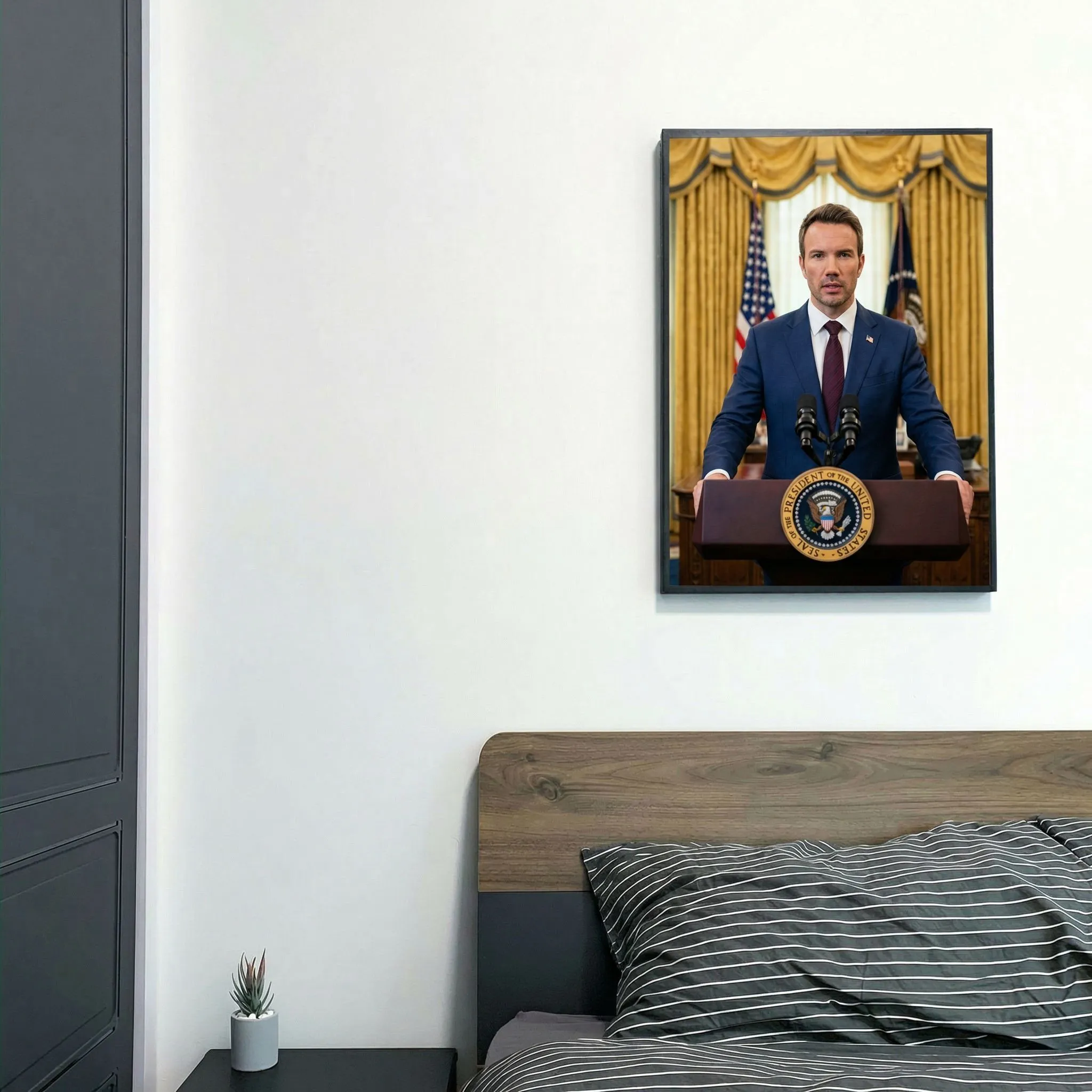 A striking realistic portrait rendered with photorealistic precision, capturing an official figure at the presidential podium. Rich navy suit and burgundy tie details anchor this formal composition, perfect for executive offices or statement wall art.
