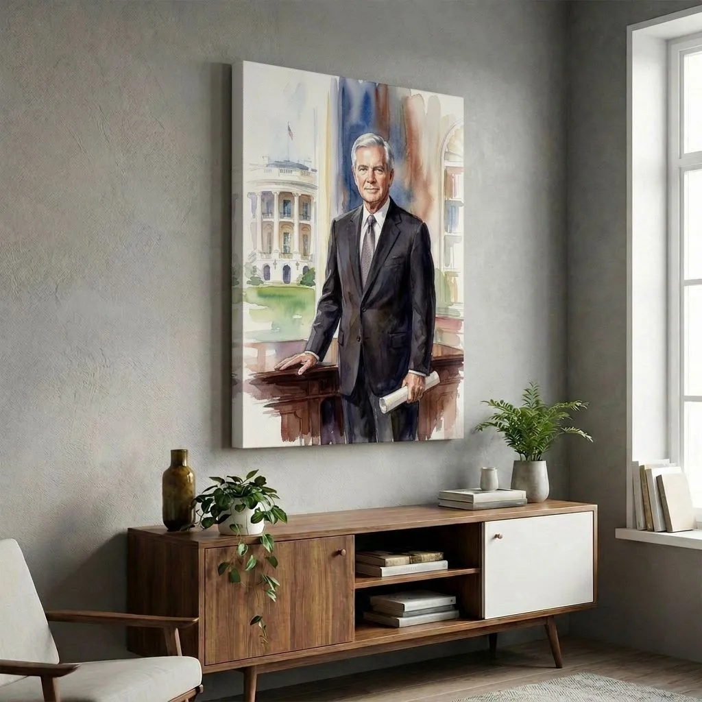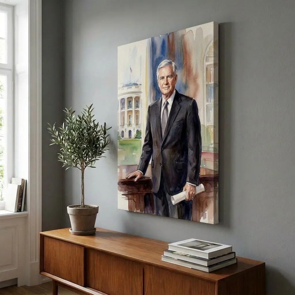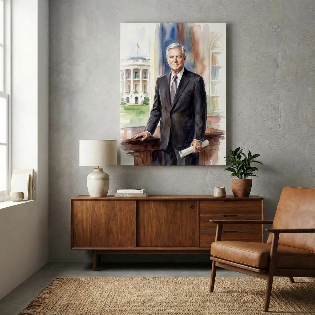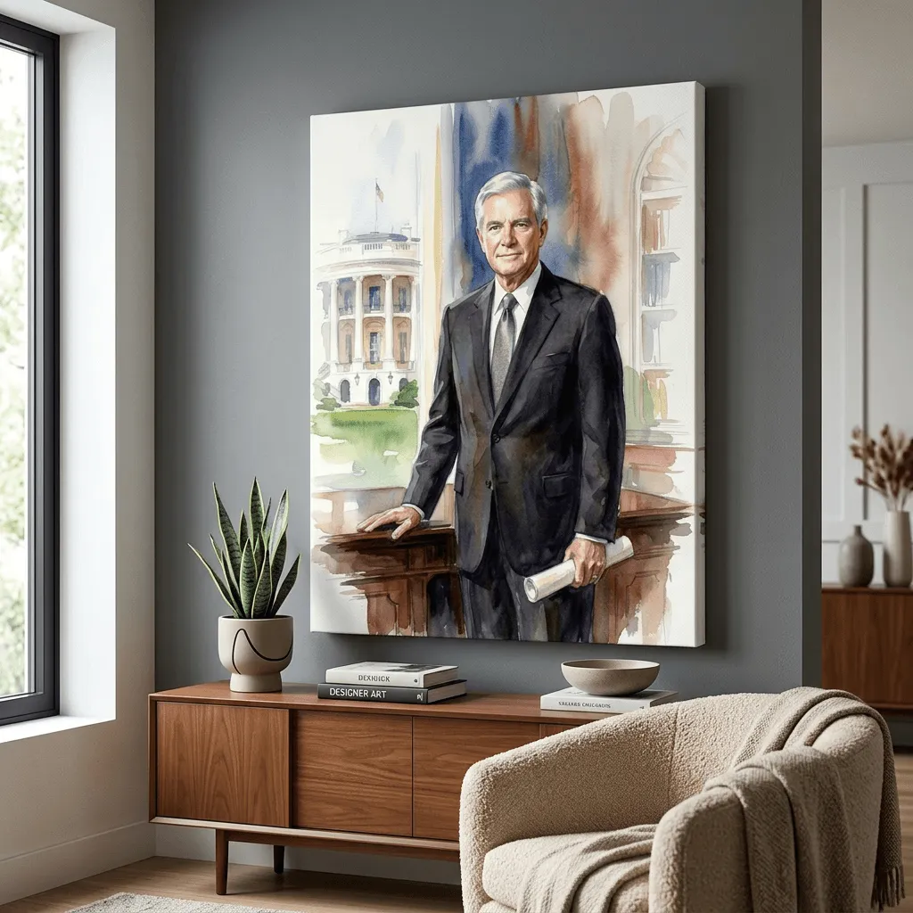 This refined watercolor portrait captures a distinguished gentleman in formal business attire against an iconic White House backdrop. Soft washes and delicate brushwork create an elegant, authoritative presence perfect for executive offices or formal living spaces.