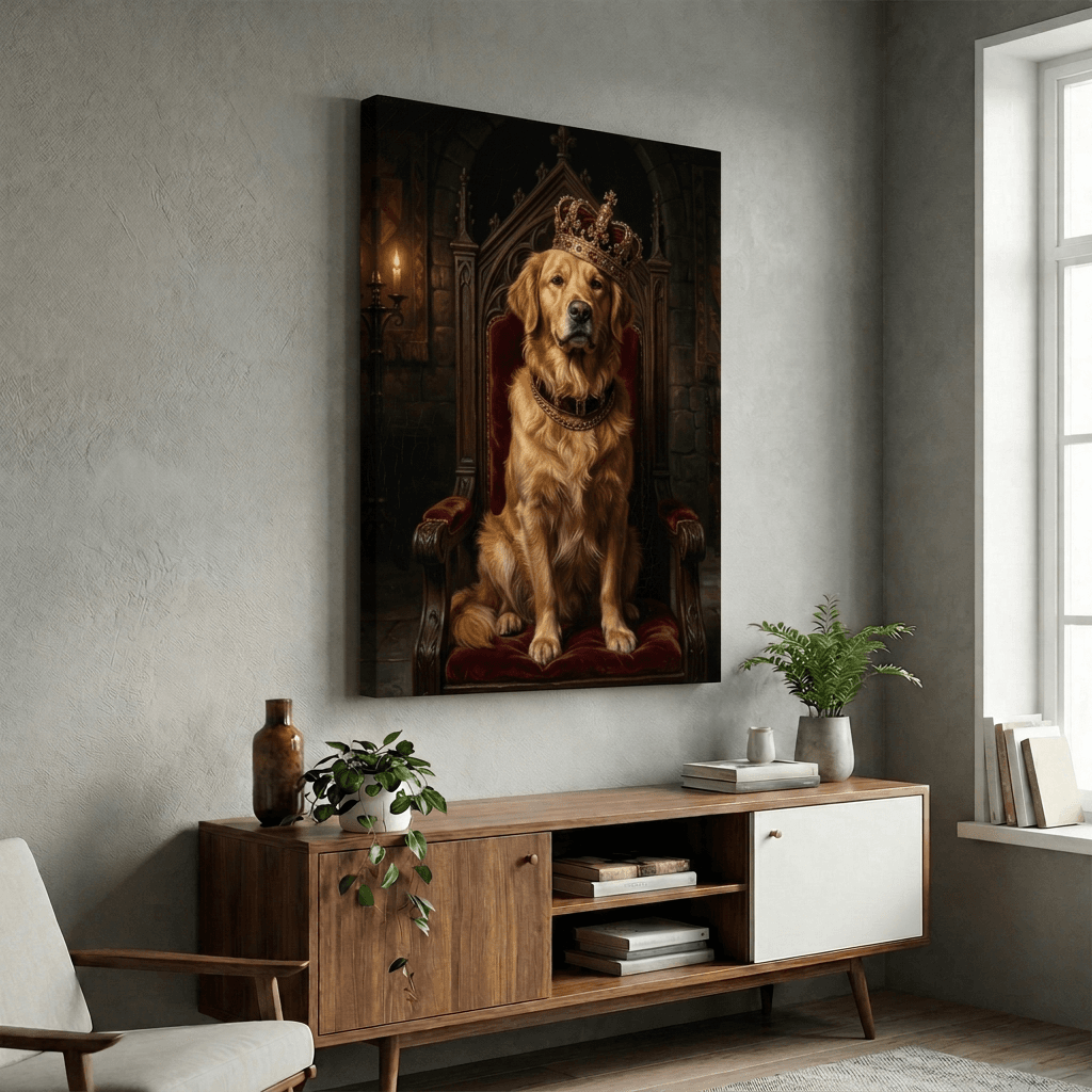 This striking digital oil painting captures a regal golden retriever adorned with an ornate jeweled crown and gold chain, seated upon a velvet throne in a gothic castle. Rich, warm amber tones and dramatic lighting create a commanding portrait perfect for adding whimsical elegance to any room.