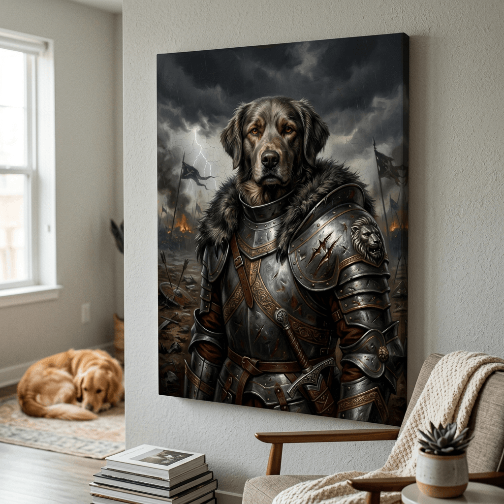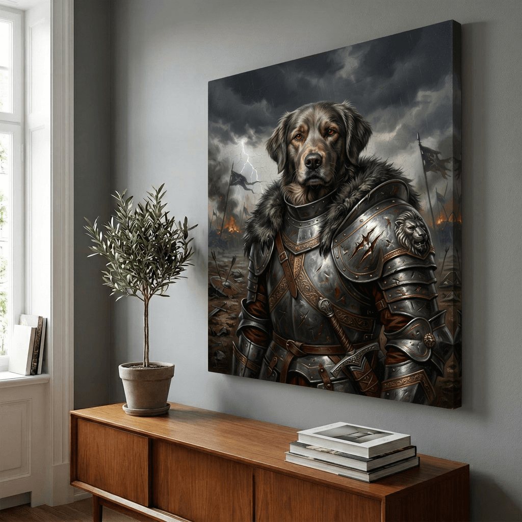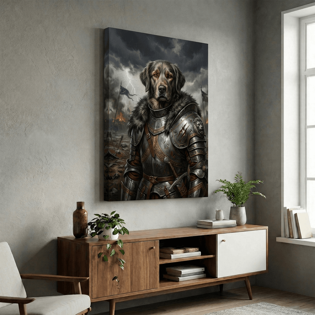 This striking digital artwork renders a noble dog in ornate medieval armor against a dramatic stormy battlefield backdrop. Rich metallic details and golden filigree contrast with dark, moody skies and lightning, creating a powerful canvas print that commands attention in any room.