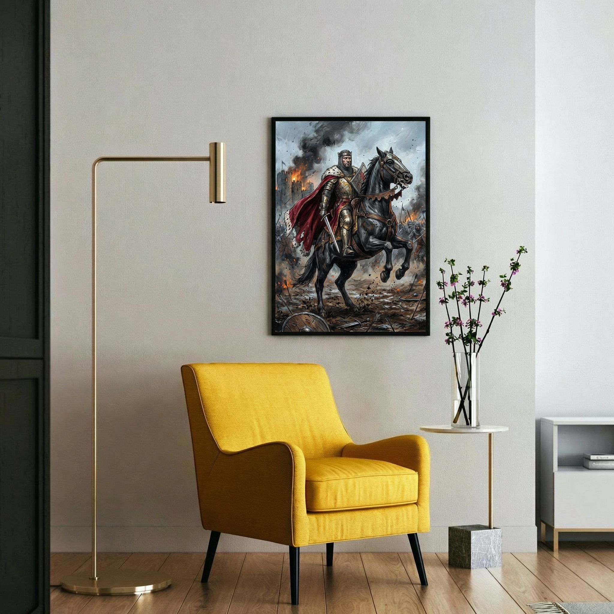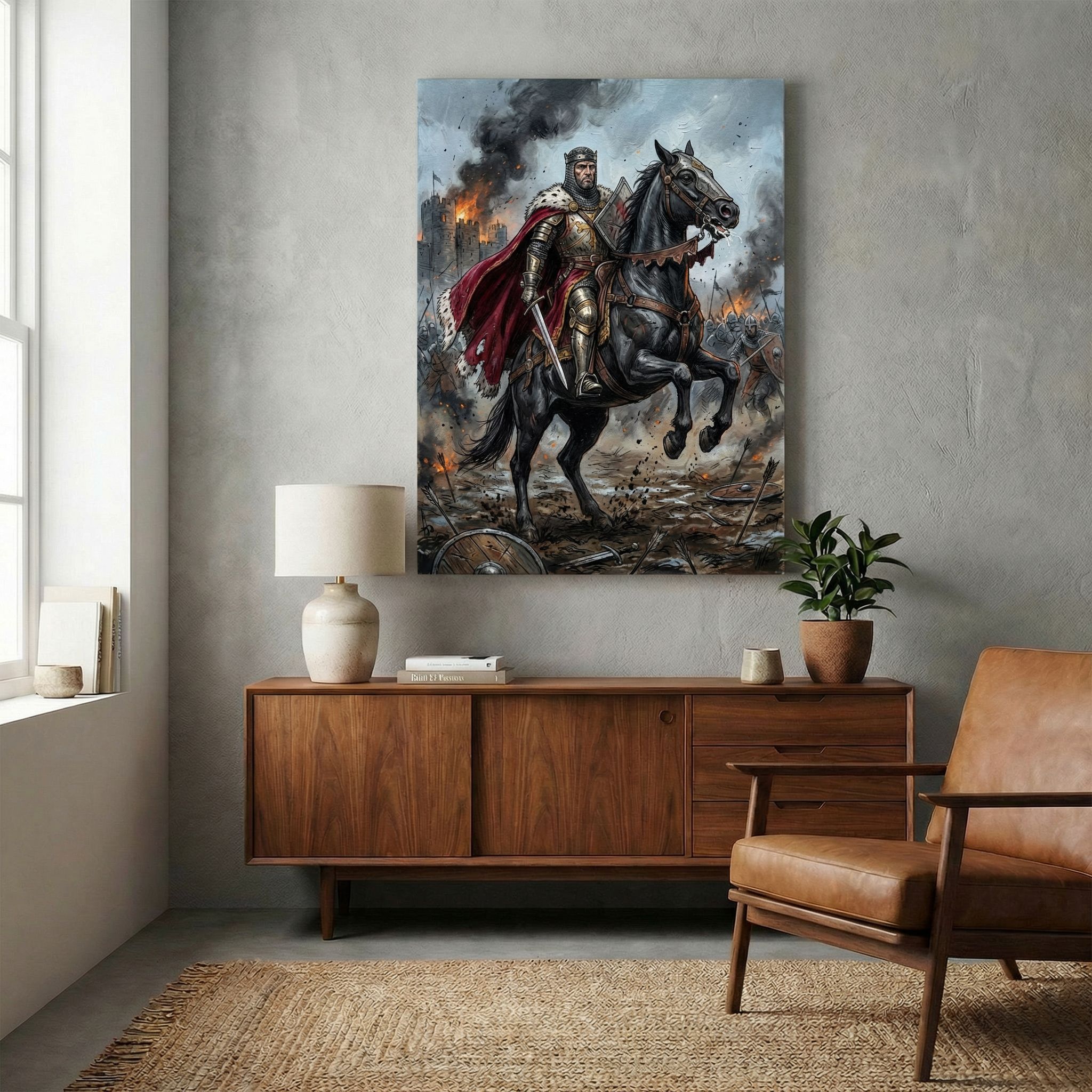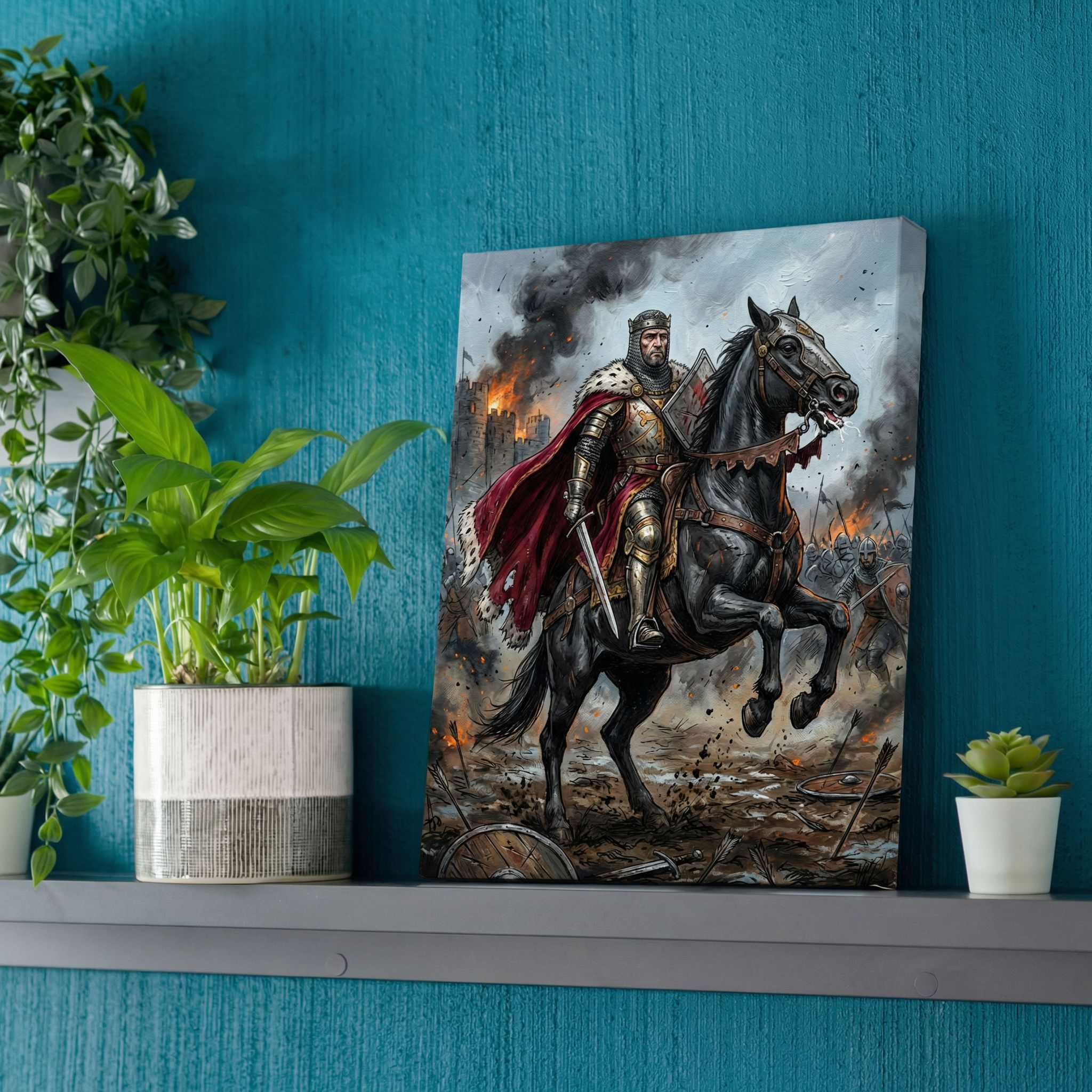 Epic medieval warrior on horseback commands attention with dramatic battle scenes and rich detail. This striking canvas print brings historical adventure and bold storytelling to your wall, perfect for adding dramatic flair to any room.