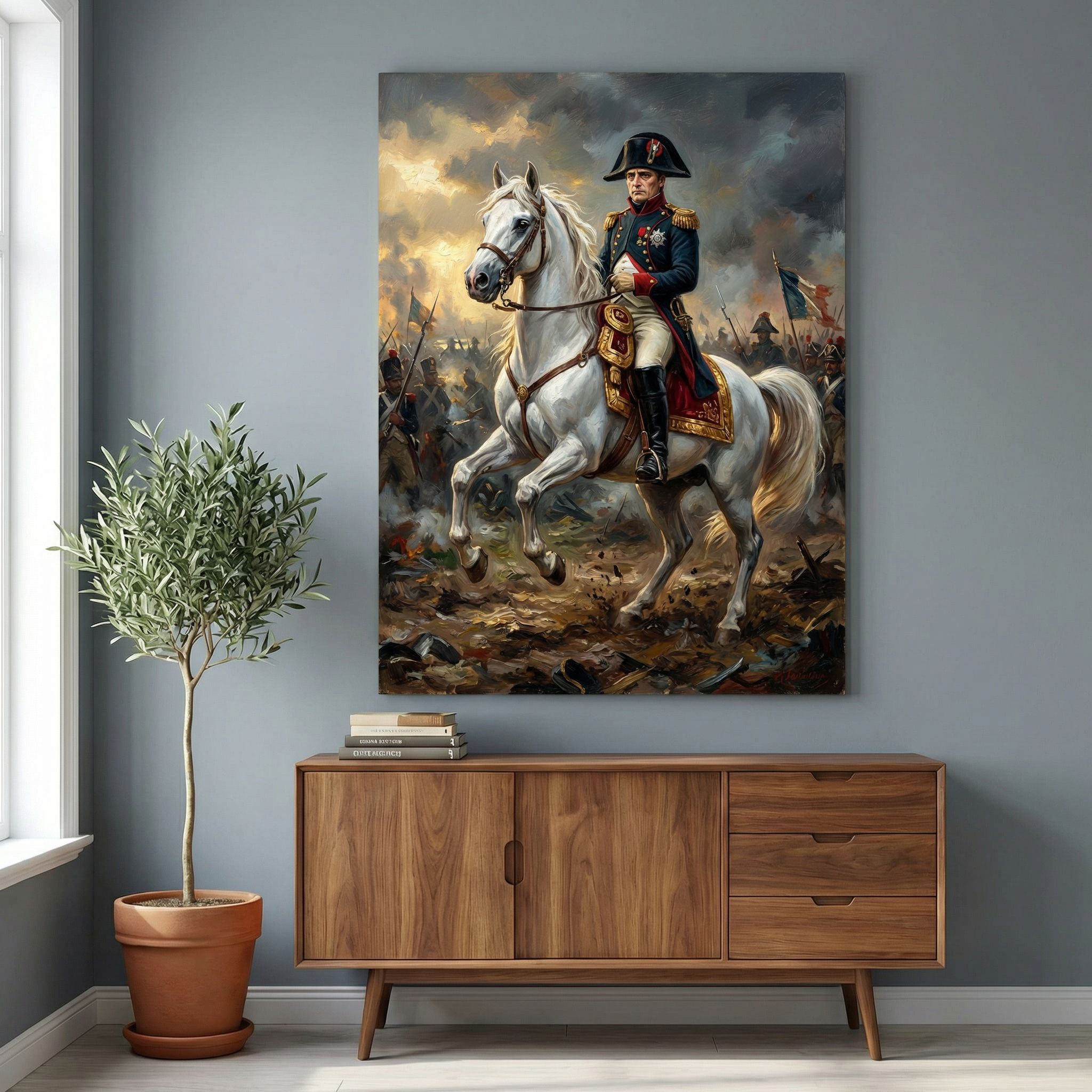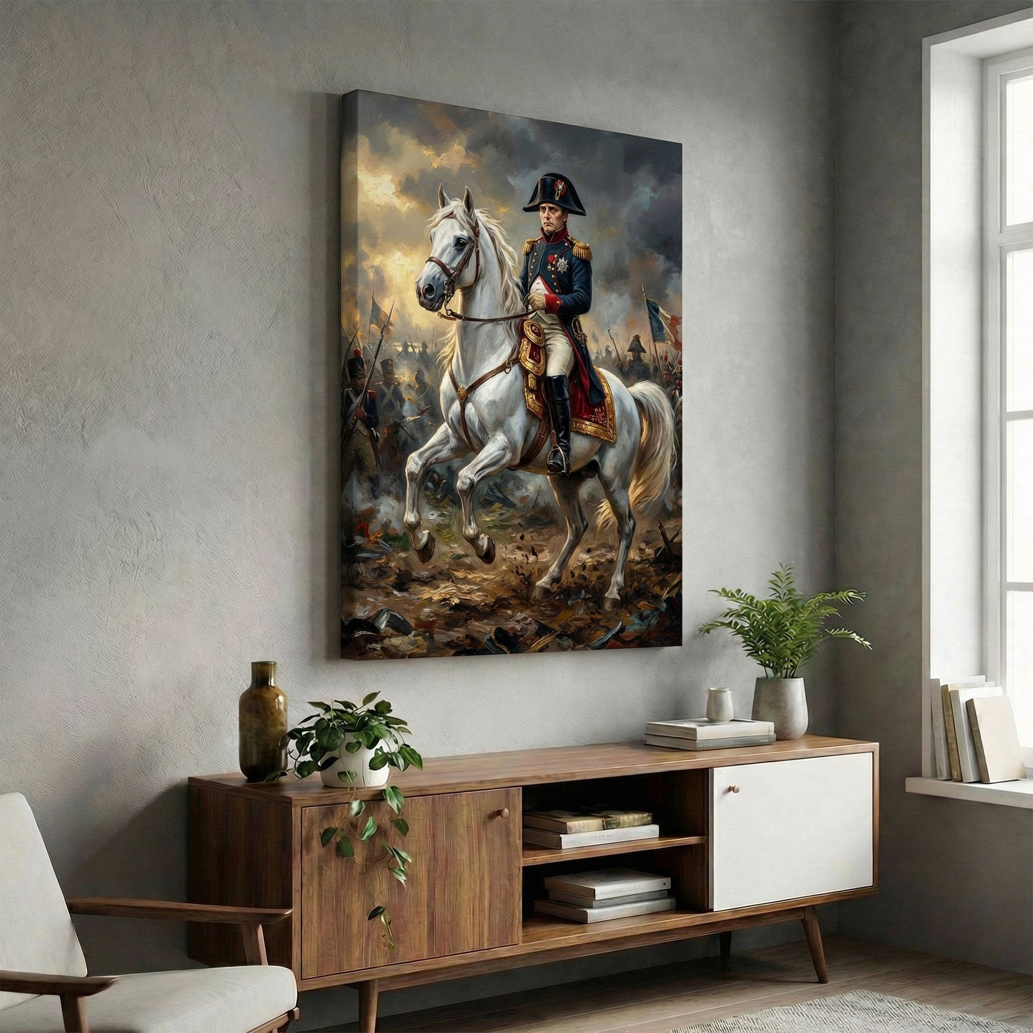 Majestic historical portrait of Napoleon Bonaparte mounted on a white horse in full military regalia. This dramatic canvas print captures the power and elegance of classical military portraiture, perfect for adding sophisticated historical charm to any room.