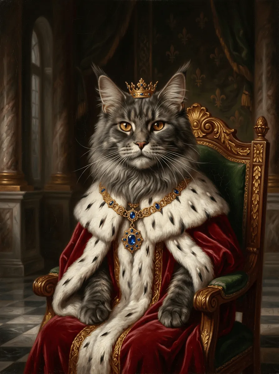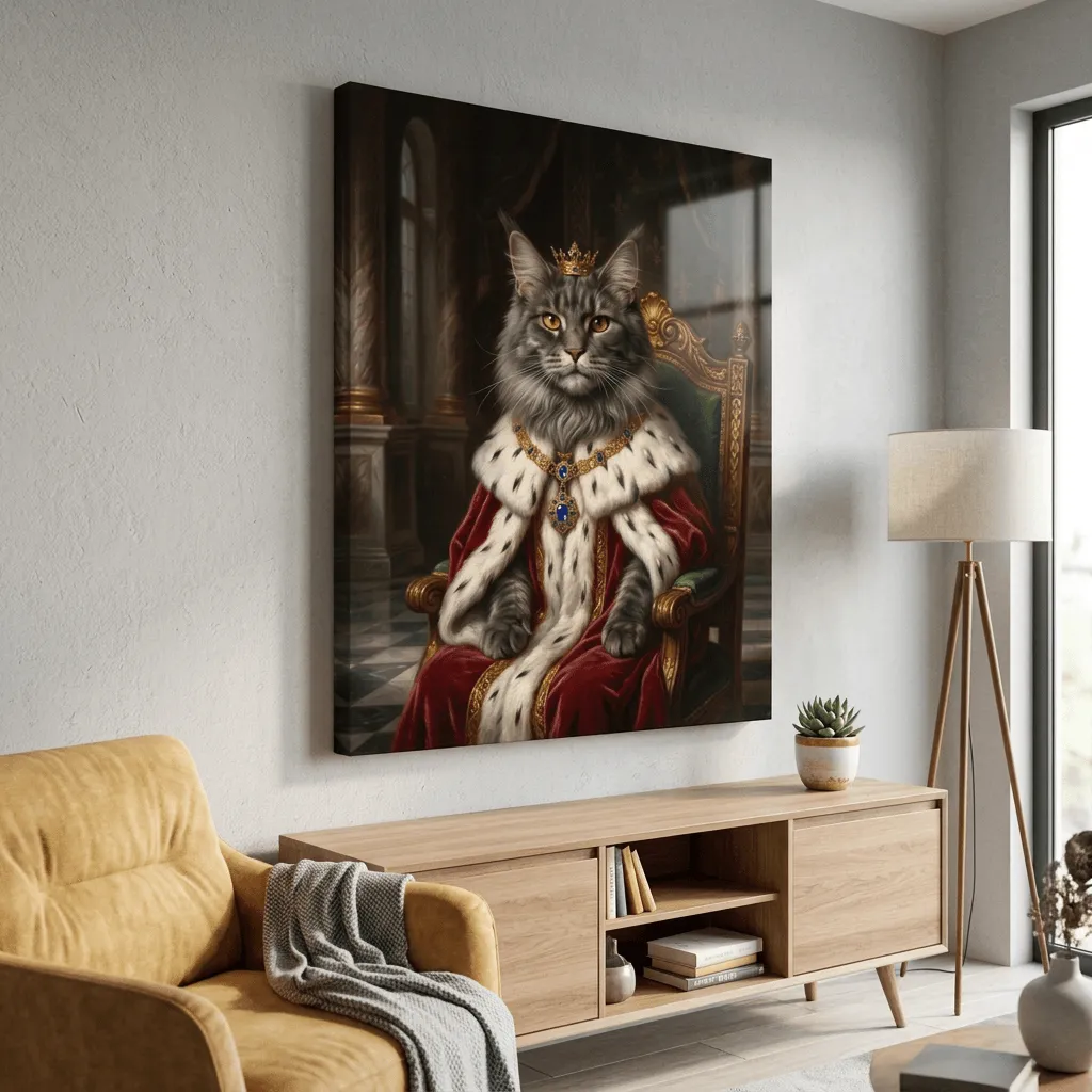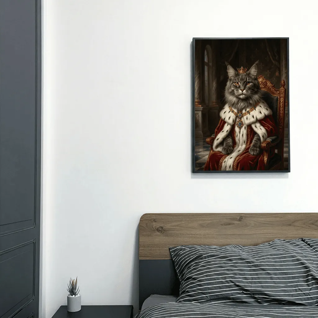 Rendered in rich oil paint textures, this striking feline portrait features a majestic cat adorned with a golden crown and jeweled necklace. Luxurious red velvet robes and ornate palace details create a regal canvas print perfect for adding sophistication to any room.