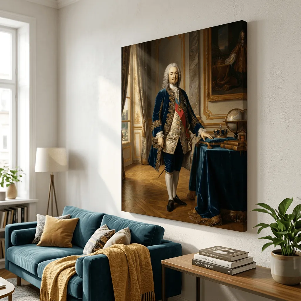 Rendered in classical oil painting technique with luminous detail, this striking portrait captures an 18th-century nobleman in opulent blue velvet and gold embroidery. A sophisticated canvas print that brings old-world elegance and historical grandeur to any study, library, or formal living space.