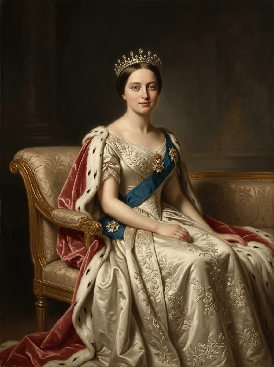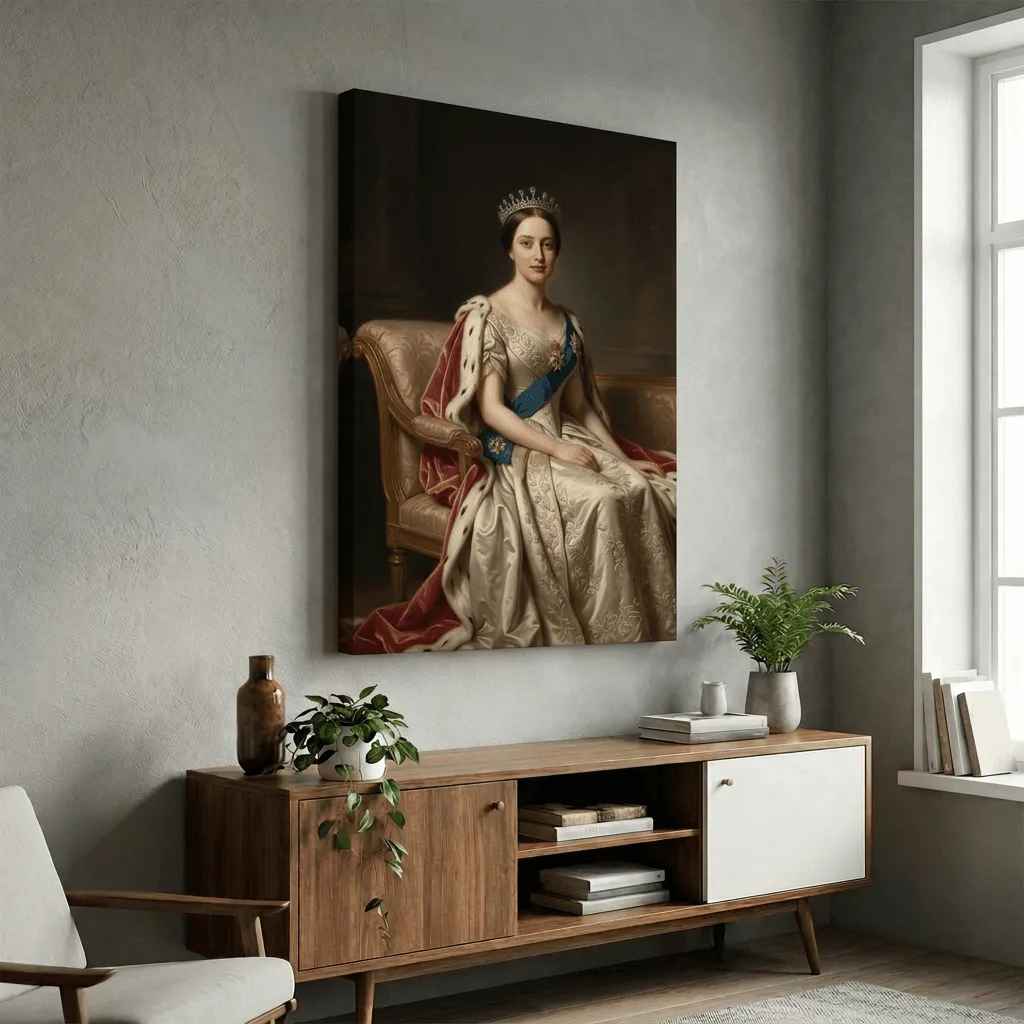 Rendered in classical oil painting technique with luminous skin tones and sumptuous fabric textures, this regal portrait captures ornate ceremonial dress with diamond tiara and ermine-trimmed robes. A sophisticated canvas print that brings timeless elegance and royal grandeur to any gallery wall or study.