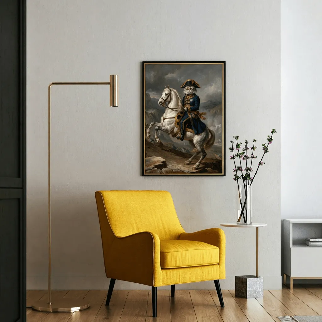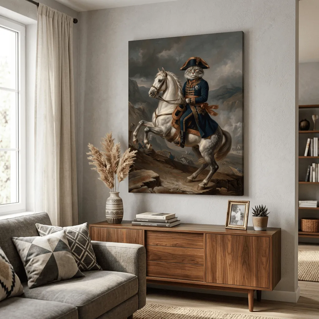 Rendered in classical oil painting technique with rich golden and deep blue tones, this whimsical canvas print features a distinguished feline general astride a rearing white steed. A striking and conversation-starting wall art piece that brings personality and artistic sophistication to any room.