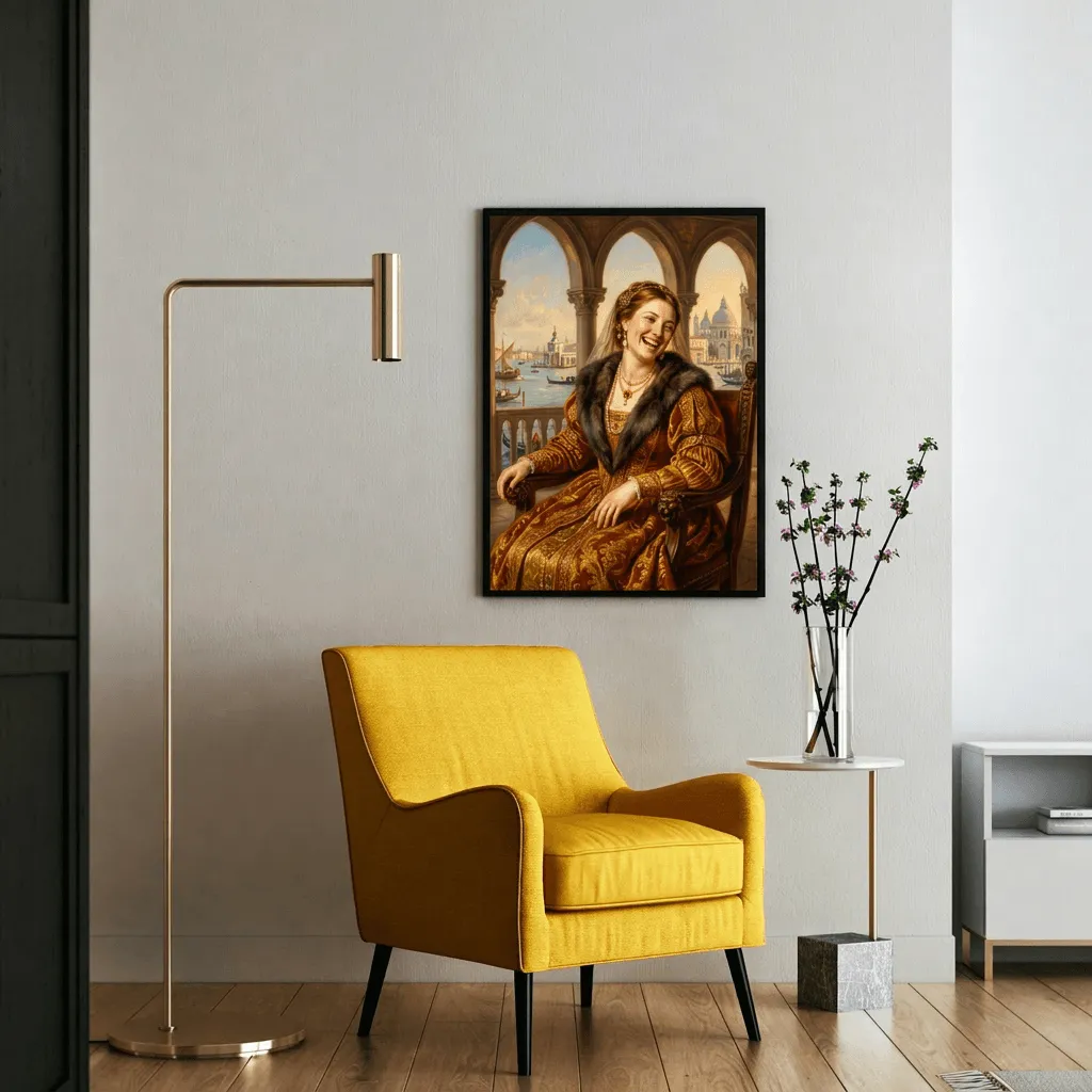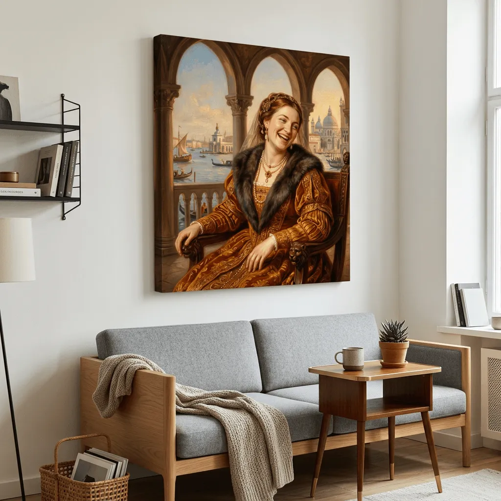 Rendered in rich oil paint with masterful Renaissance technique, this striking portrait captures a joyful noblewoman adorned in ornate golden brocade and fur against an architectural Venetian backdrop. A timeless canvas print that brings classical elegance and warm amber tones to any gallery wall or study.