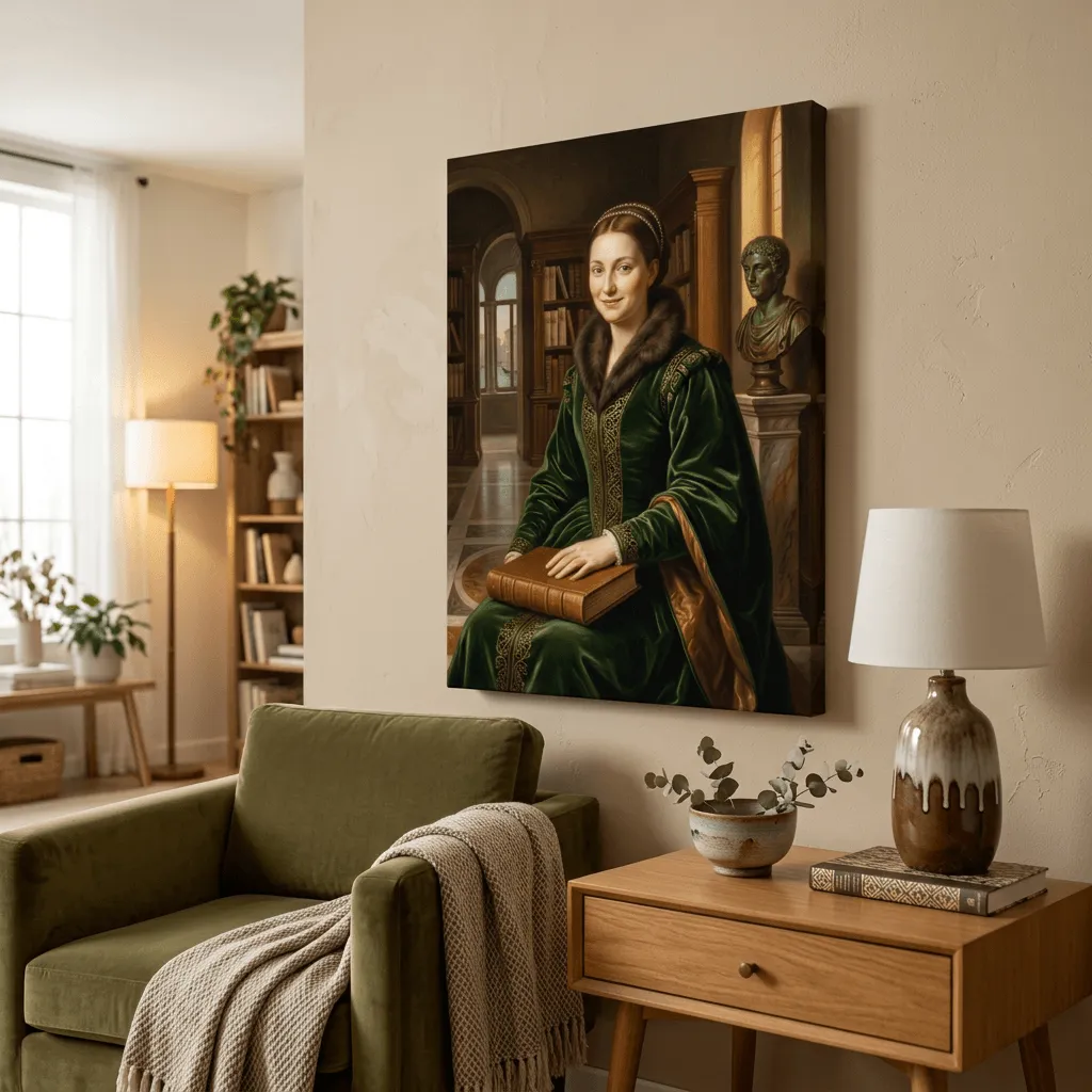 This refined oil painting captures Renaissance elegance with meticulous detail and warm golden lighting. A striking portrait of a woman in emerald silk and fur, holding an ancient tome in a classical library setting—perfect canvas art for studies, libraries, or sophisticated living spaces.