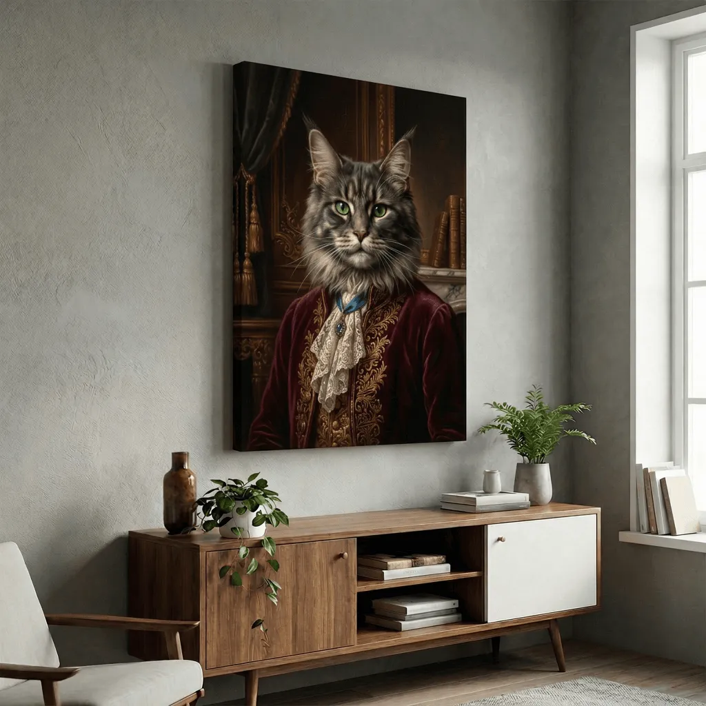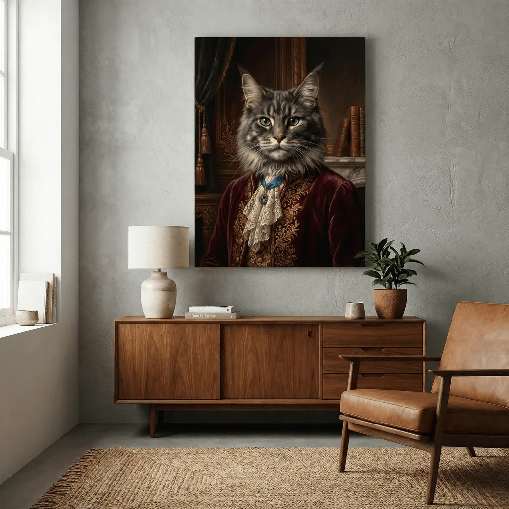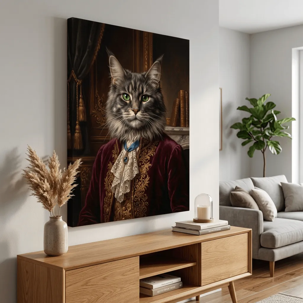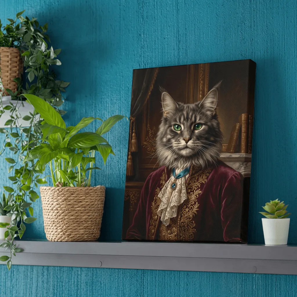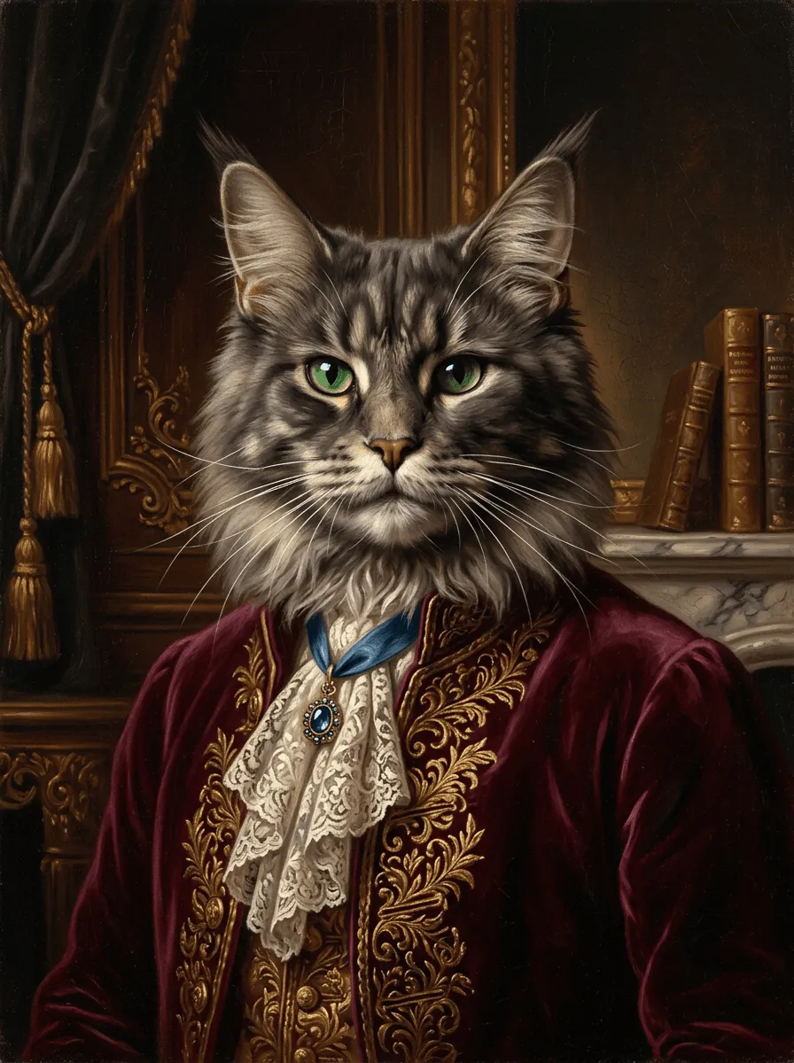 Rendered in rich oil painting textures with meticulous detail, this striking feline portrait features emerald eyes and regal burgundy velvet attire adorned with gold embroidery. A sophisticated canvas print that brings aristocratic charm and whimsy to any room.