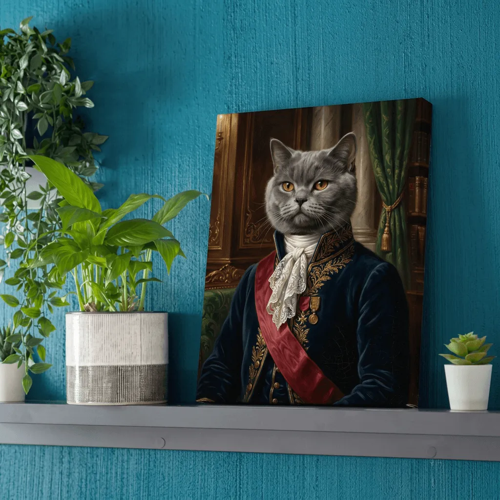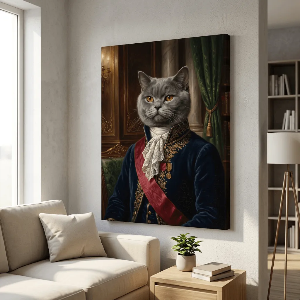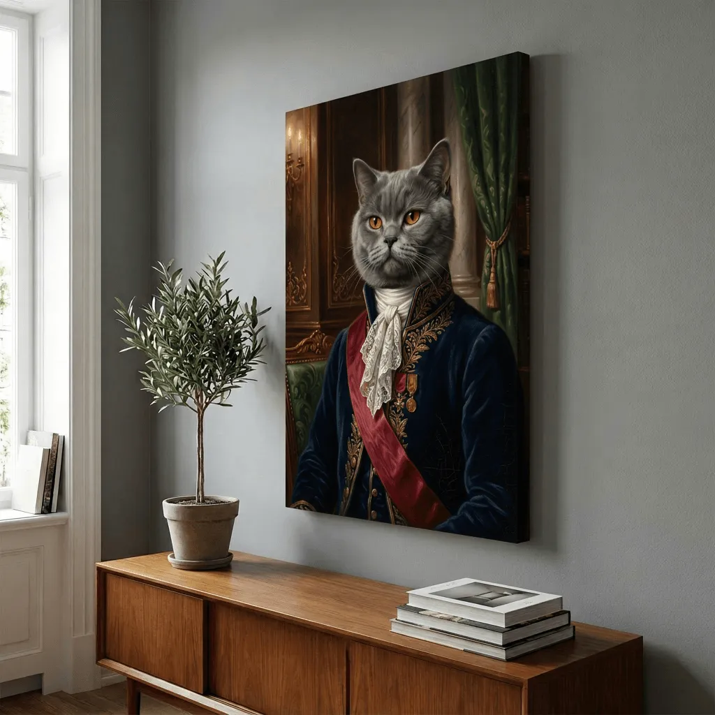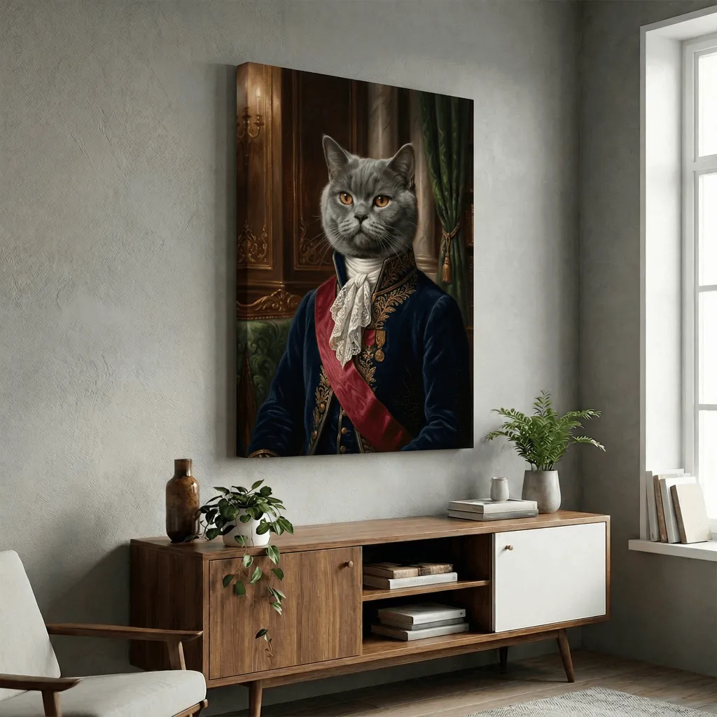 This striking realistic oil painting depicts a dignified gray cat adorned in ornate royal military dress with golden embroidered details, crimson sash, and medals. The meticulous brushwork and rich jewel-toned palette create a commanding presence perfect for adding personality and sophistication to any room.